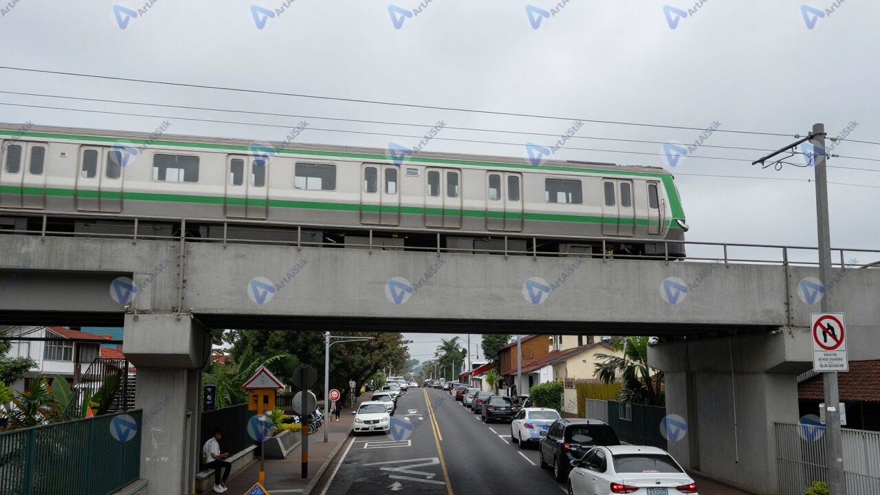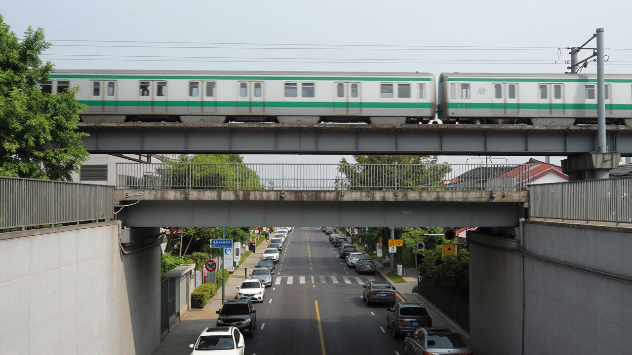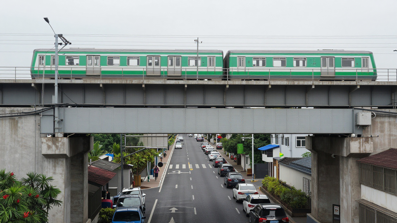 Эстакада метро над улицей, поезд на виадуке.