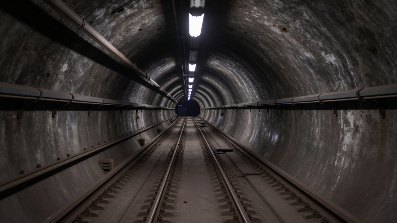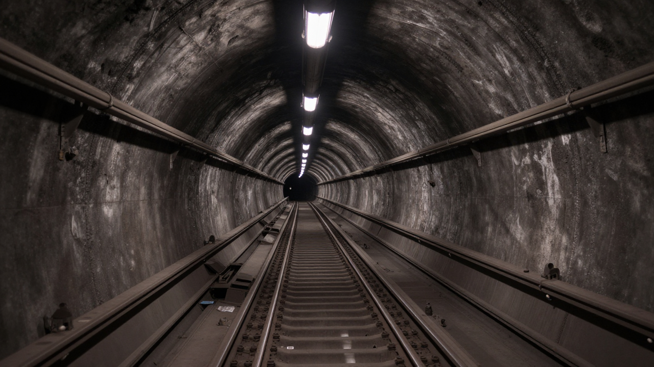 Тоннель метро с огнями в перспективе, пустые рельсы.