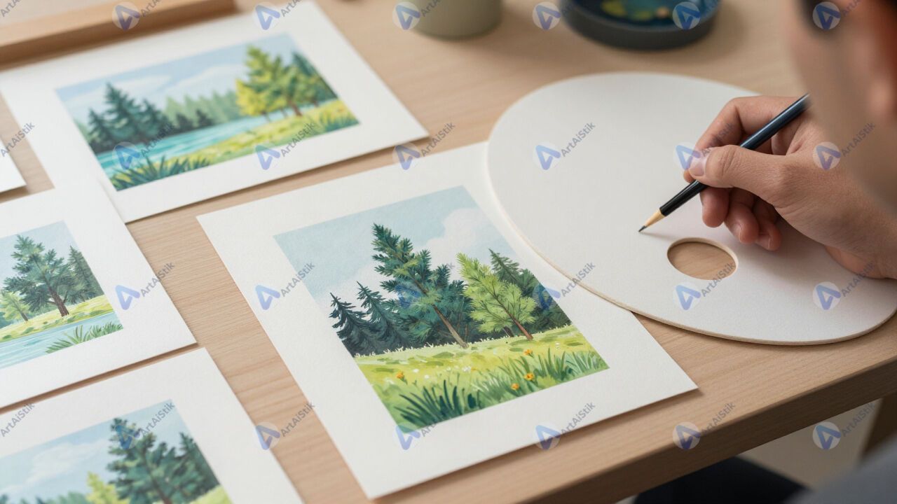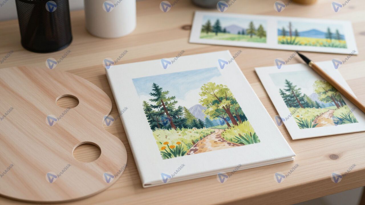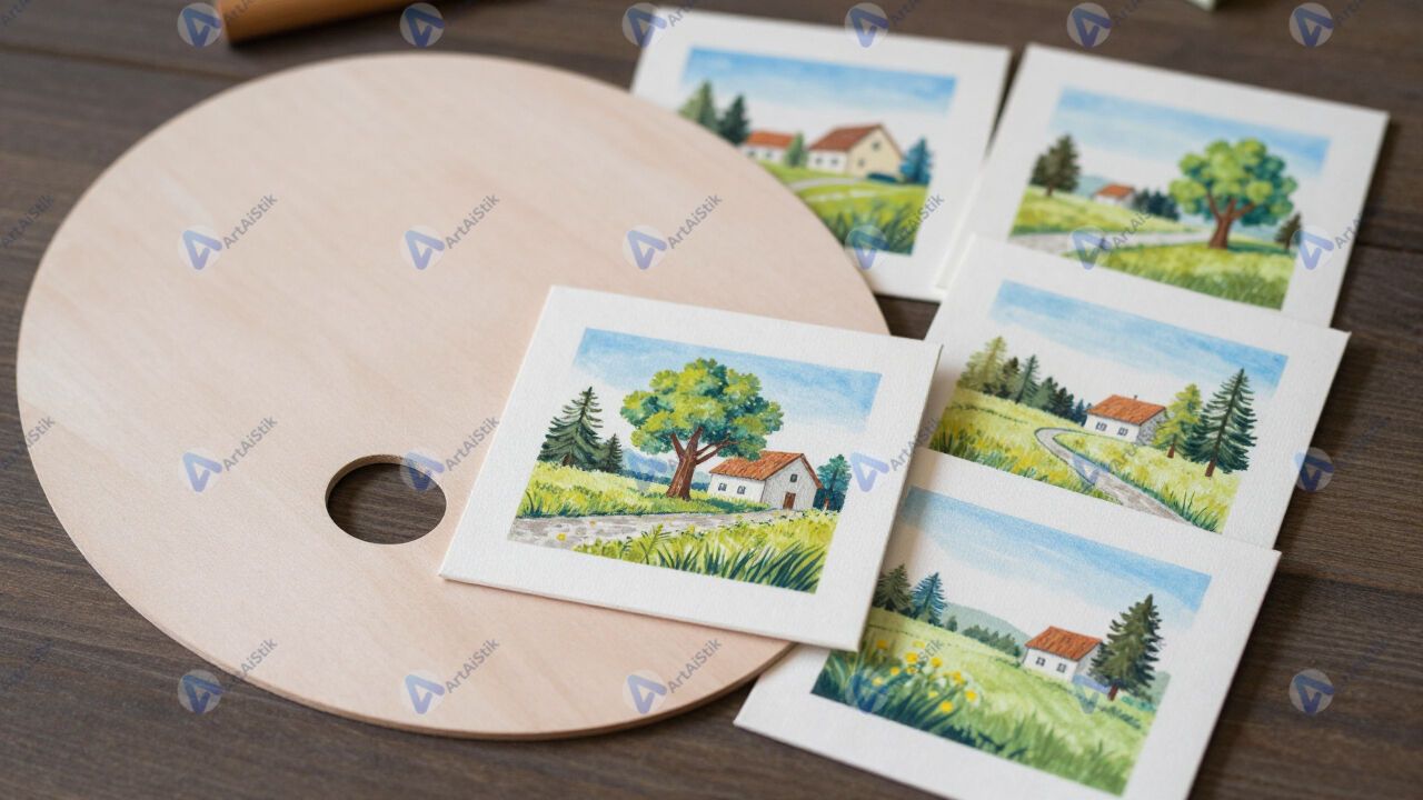 Стол с палитрой и несколькими небольшими холстами‑этюдами.