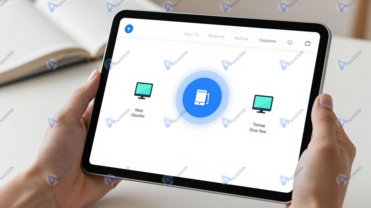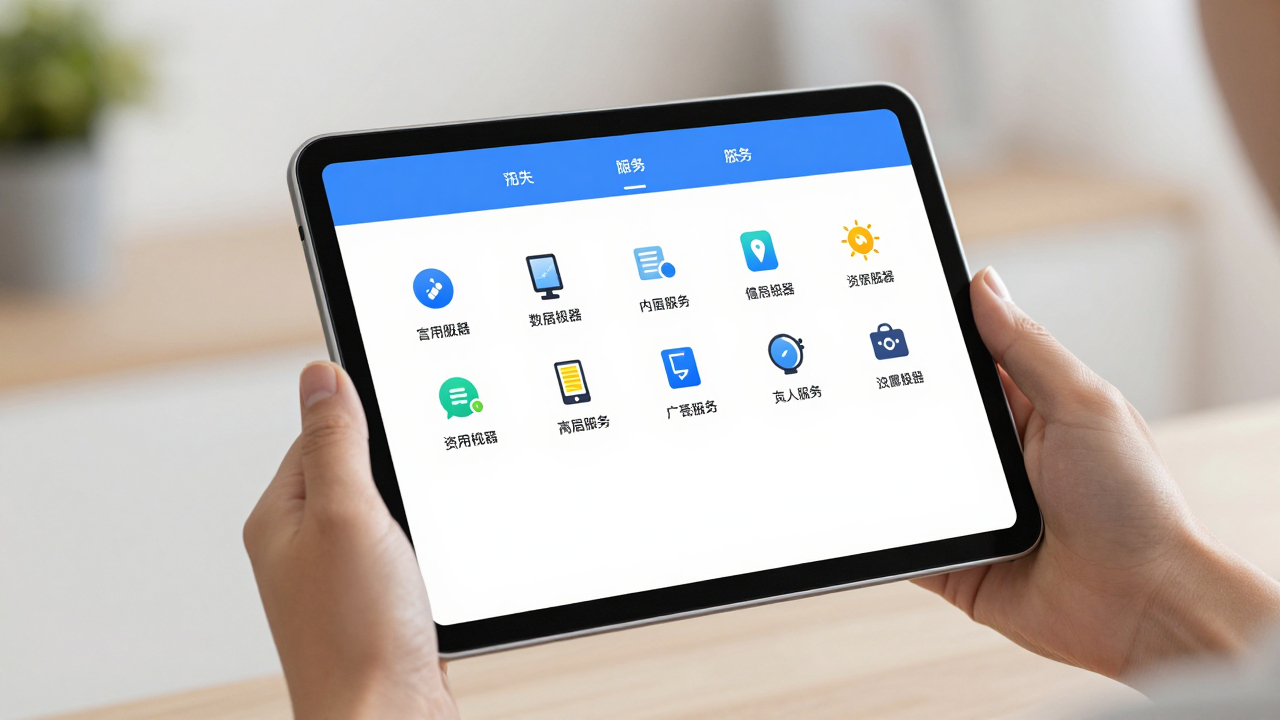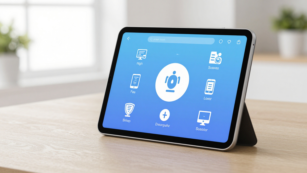 Планшет с приложением управления «умным домом», иконки устройств.