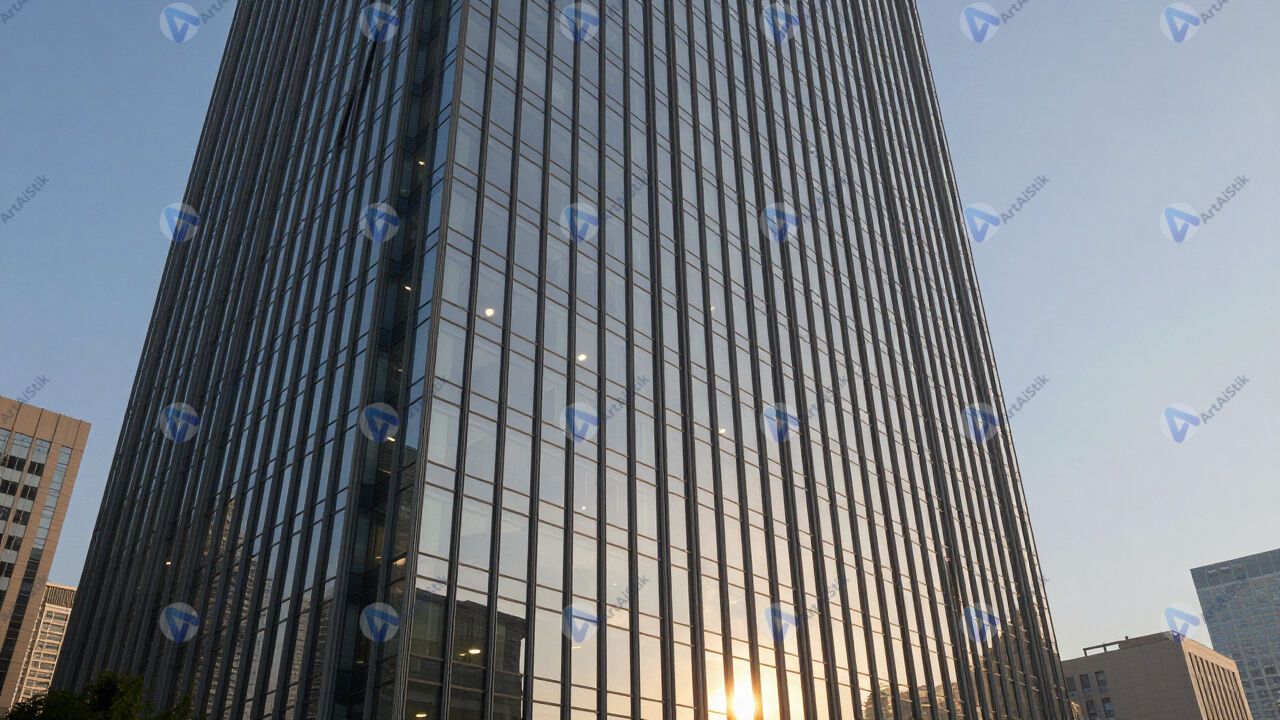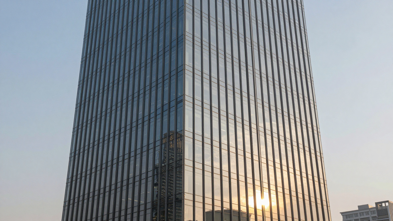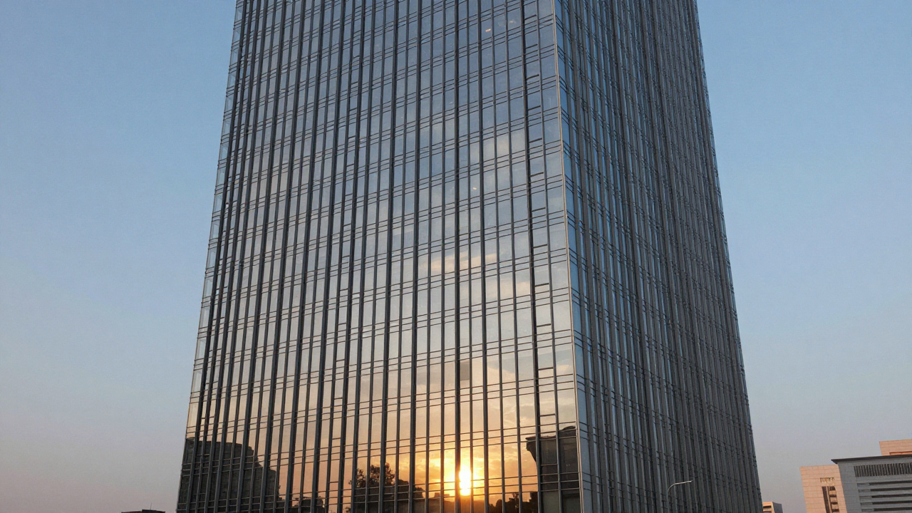 Высокий стеклянный бизнес‑центр, отражающий закат.