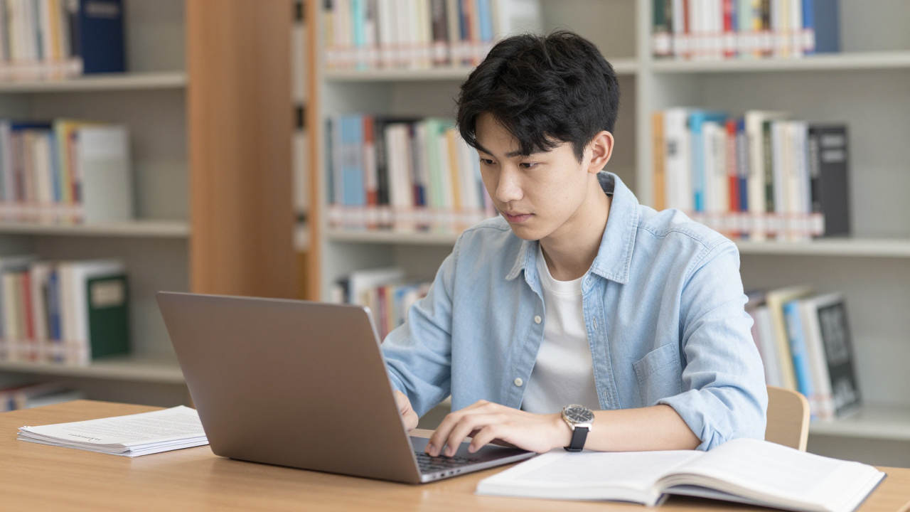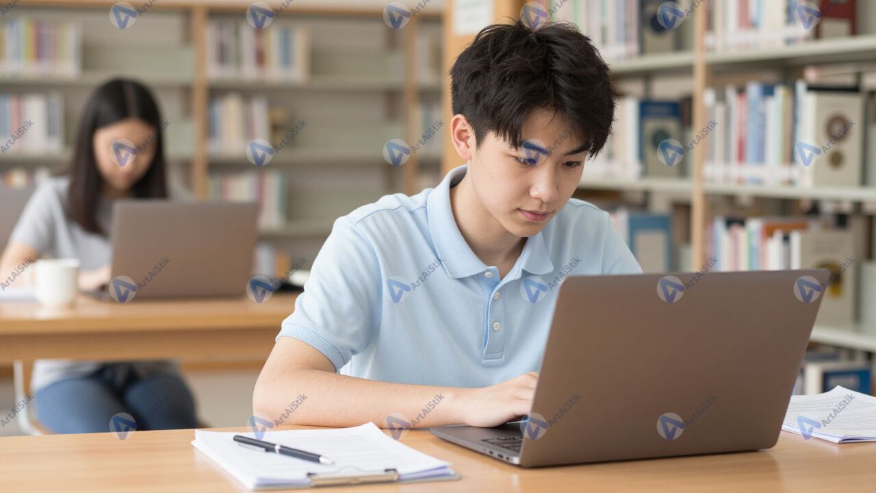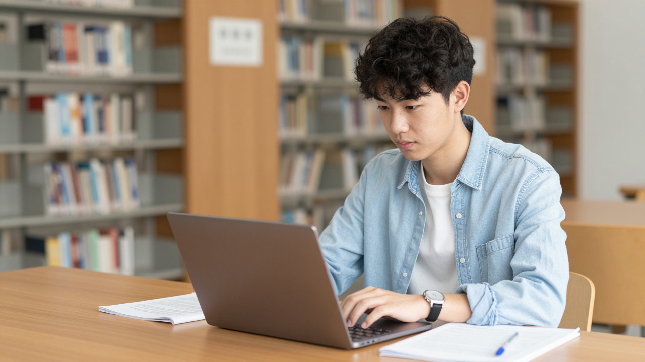 Подросток в библиотеке за ноутбуком, экзамены.