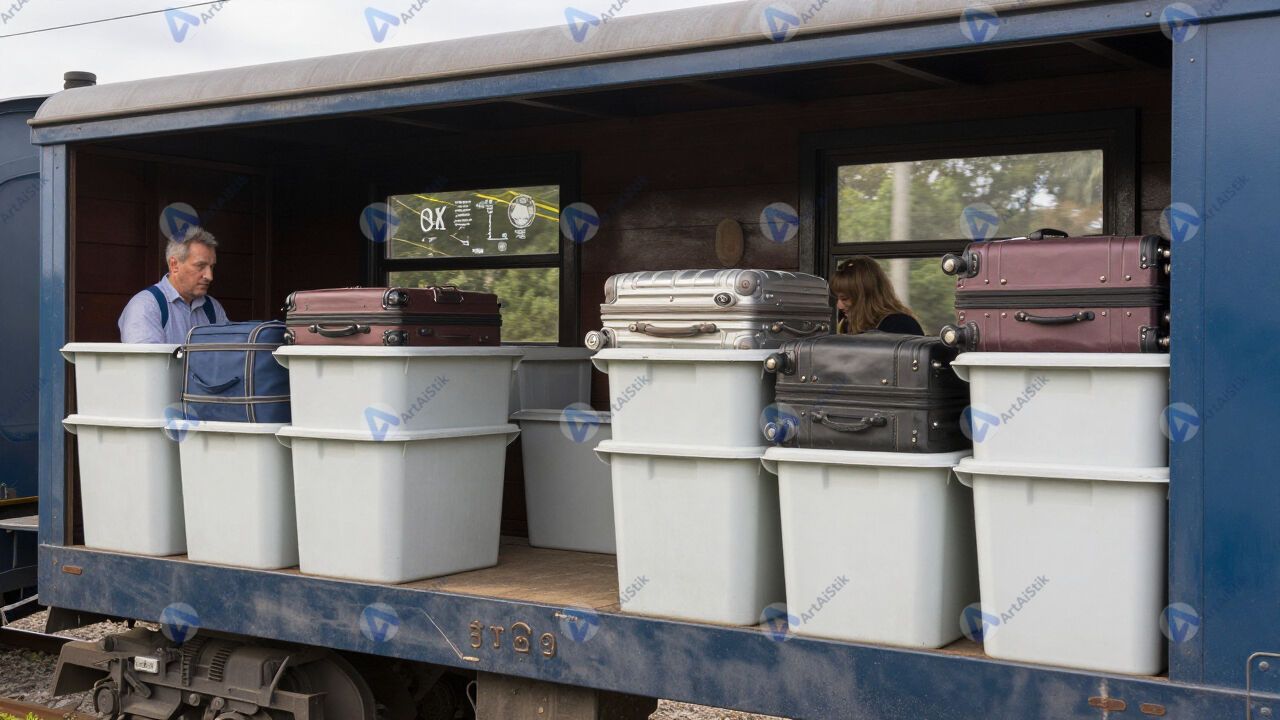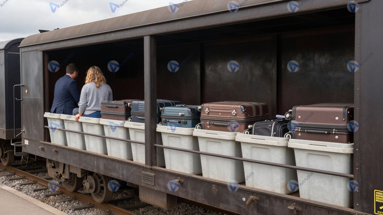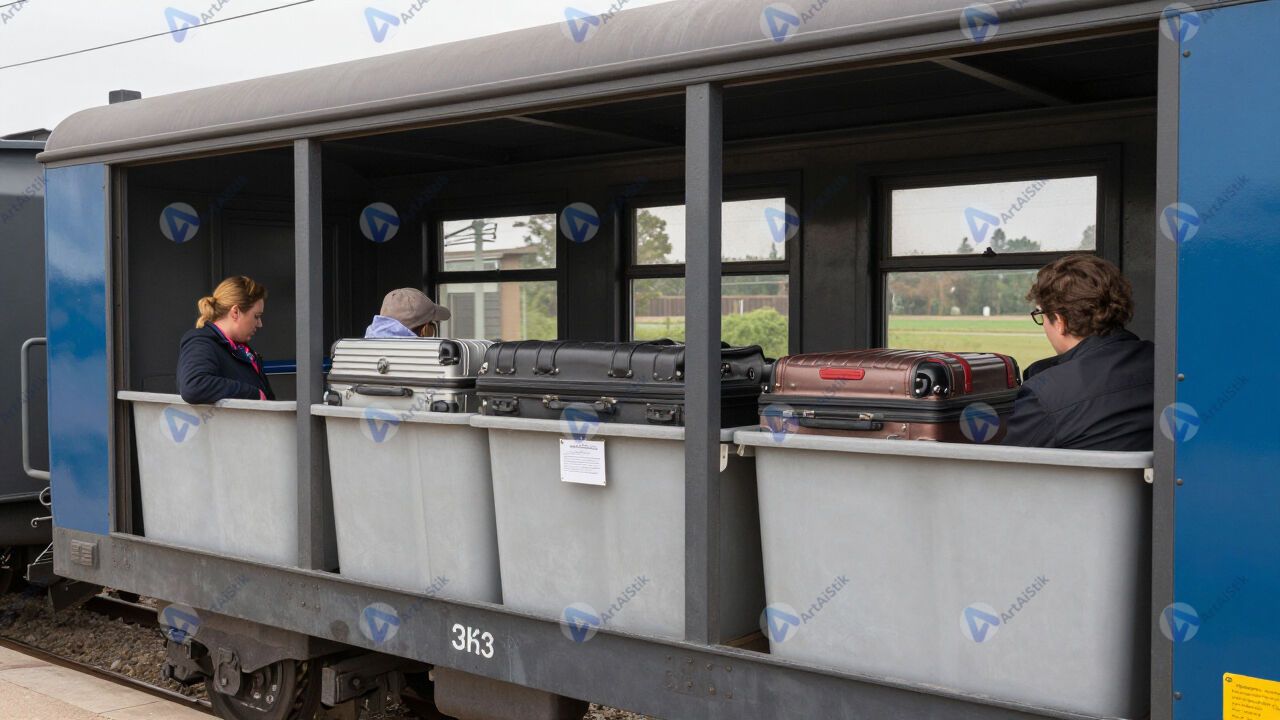 Вагон поезда с полками и чемоданами пассажиров.