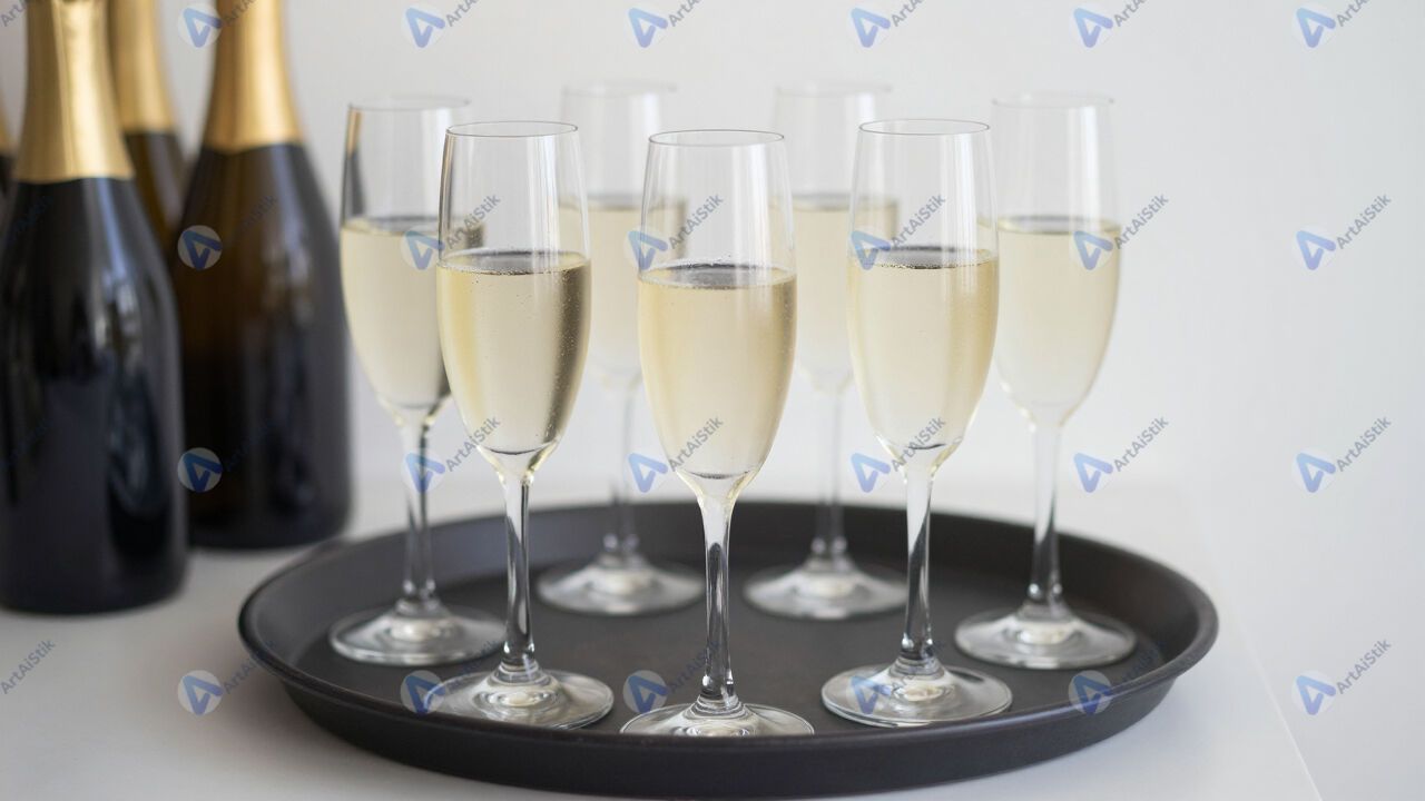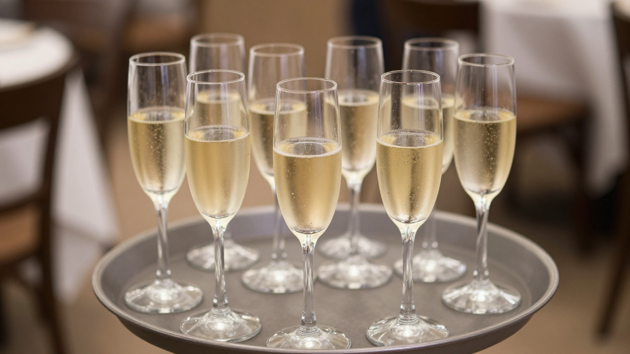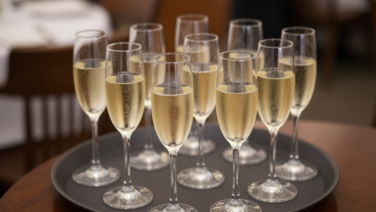 Поднос с бокалами шампанского, готовыми к подаче.