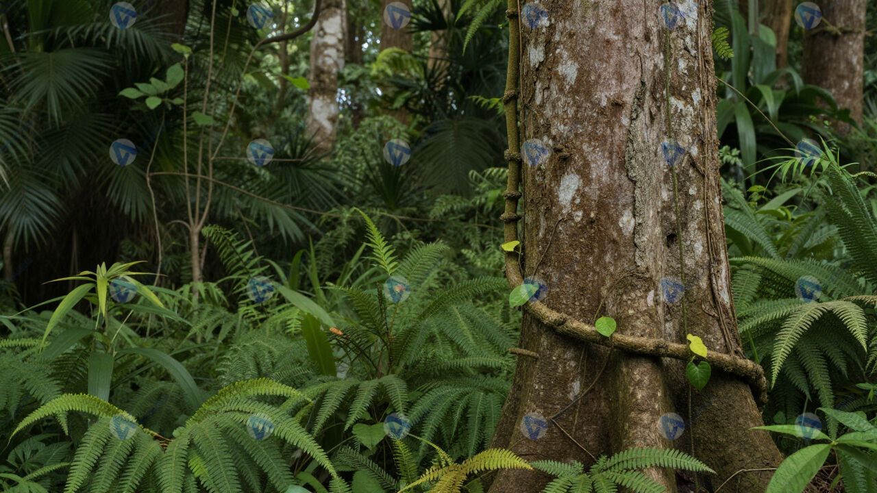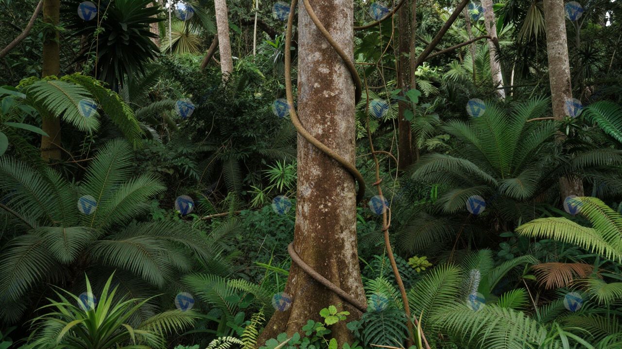 Лиана в джунглях, толстый ствол, зелёная гуща.