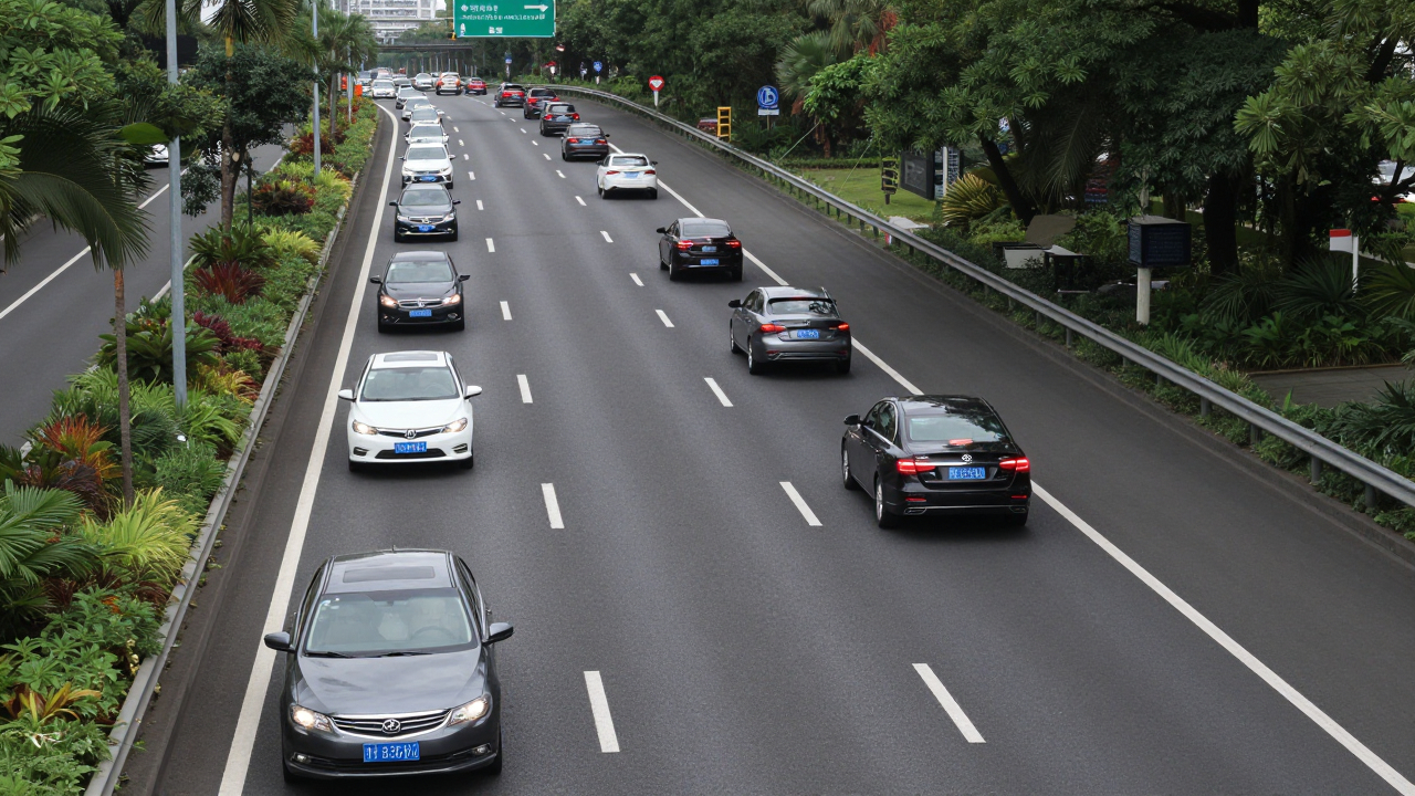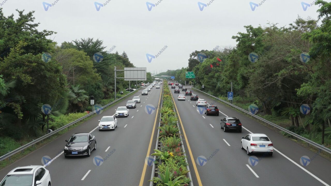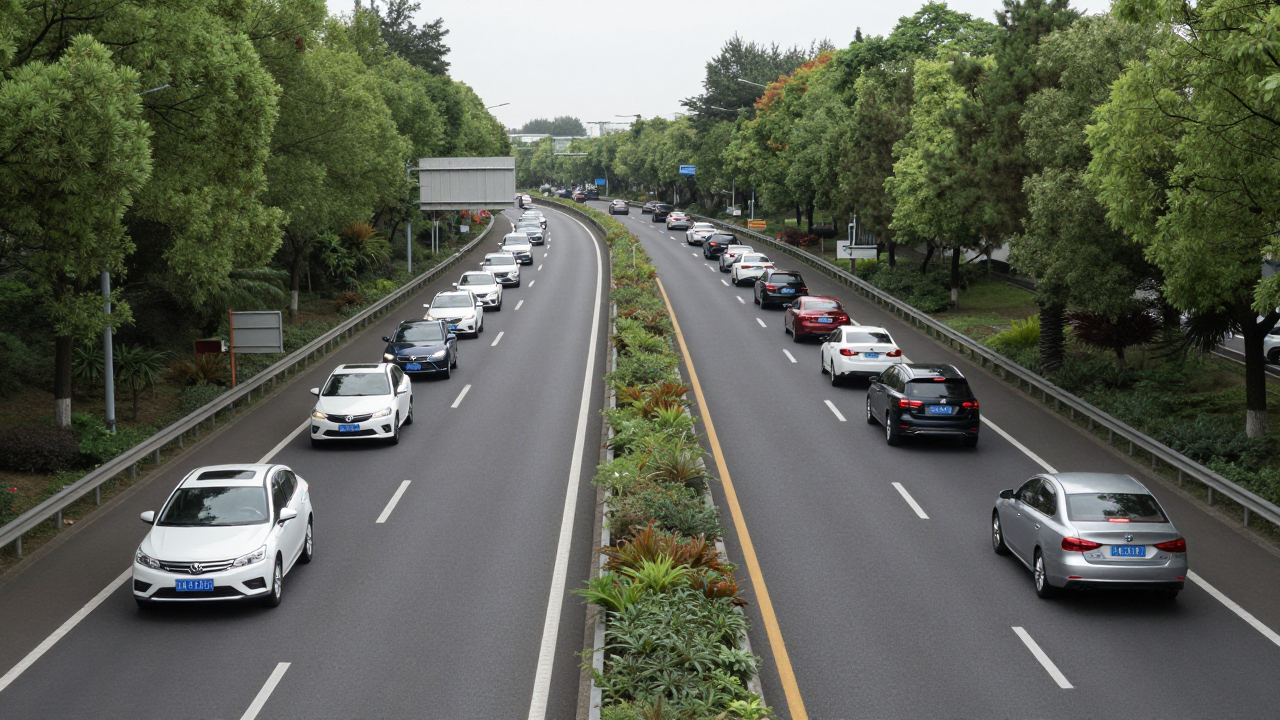 Широкая автострада, ряд машин движется по полосам.