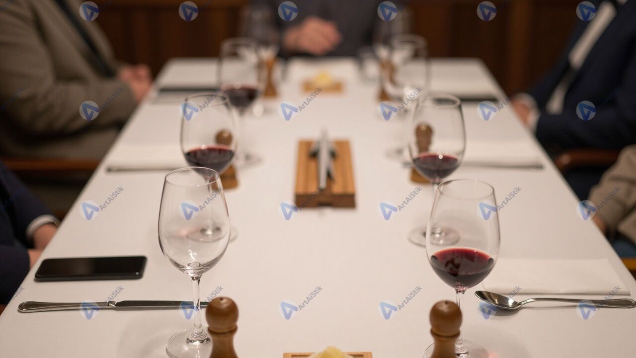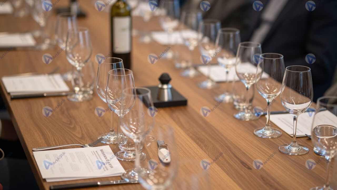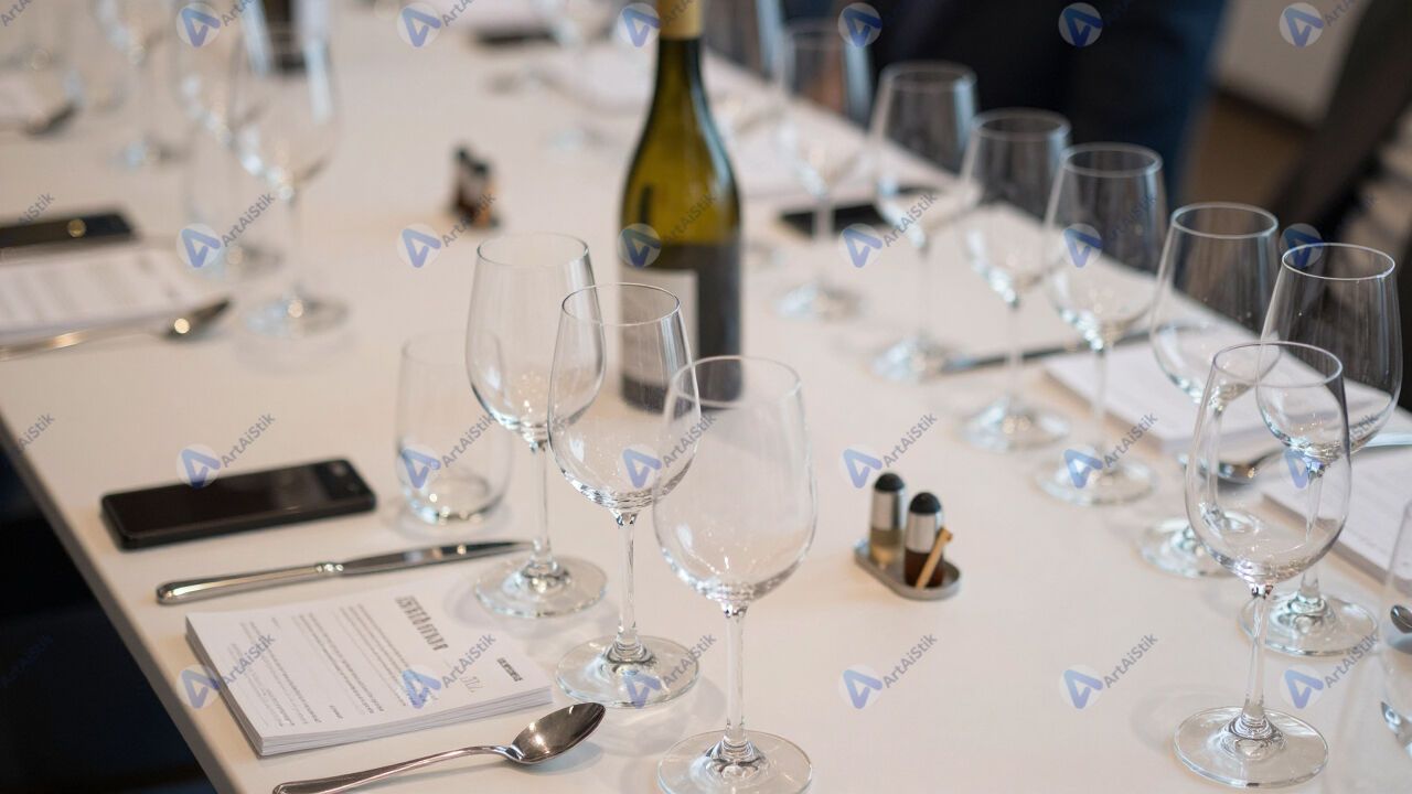 Стол для дегустации вин с рядами бокалов и плевательницами.