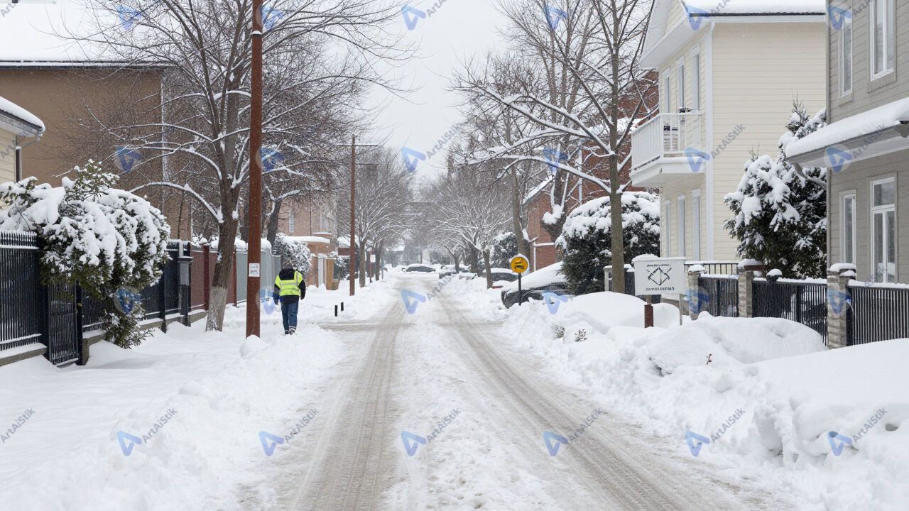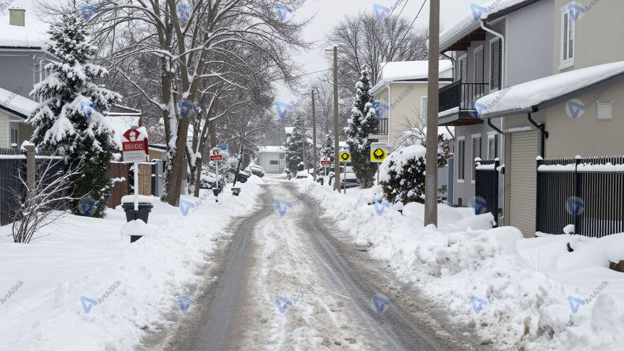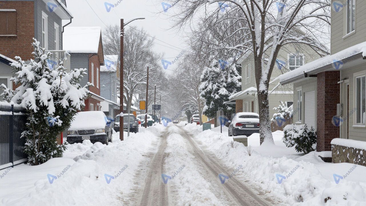Улица зимой со снежными сугробами и расчищенной дорожкой.