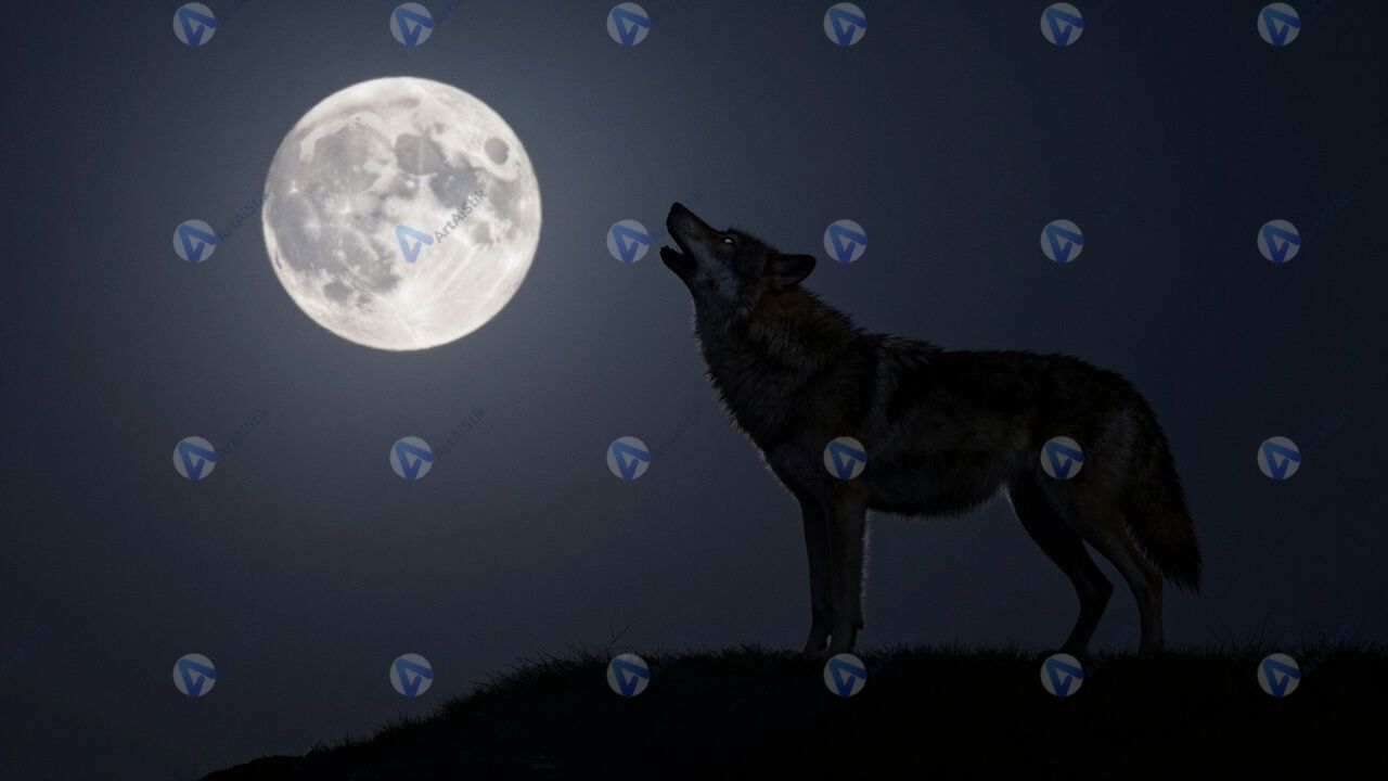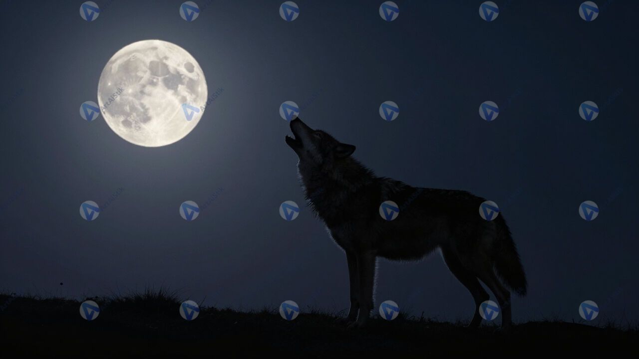 Волк воет на луну, силуэт на холме, ночь.