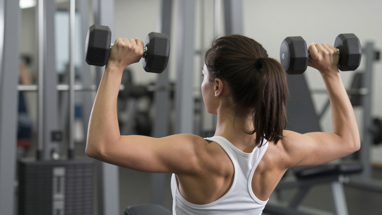 Женщина делает жим гантелей сидя, концентрируясь на движении.