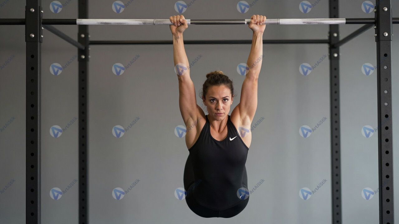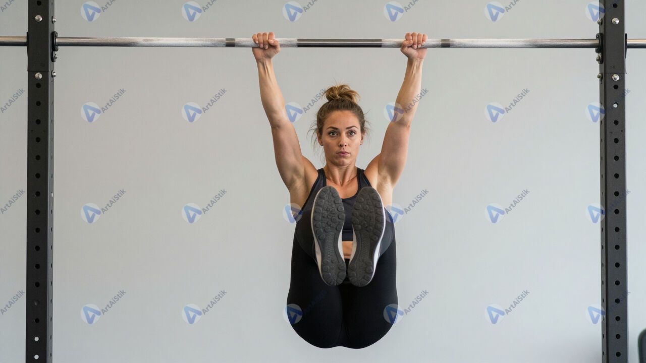 Женщина делает подъём ног в висе на турнике.