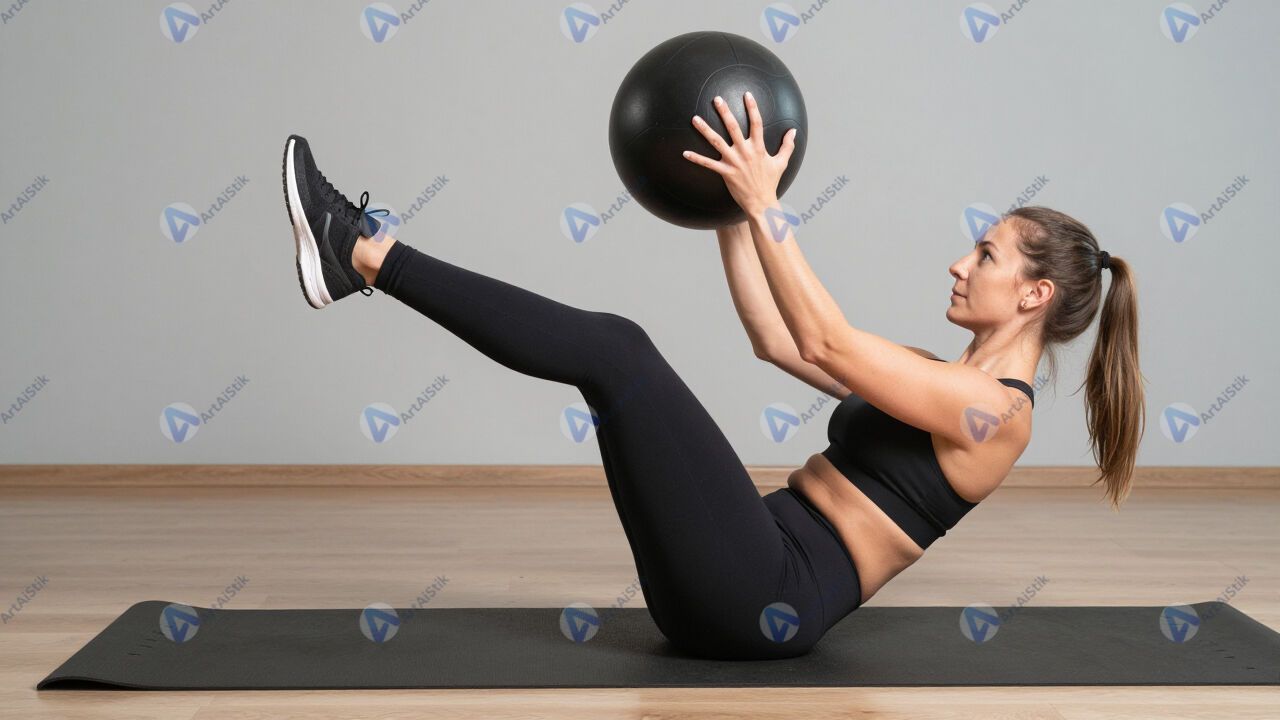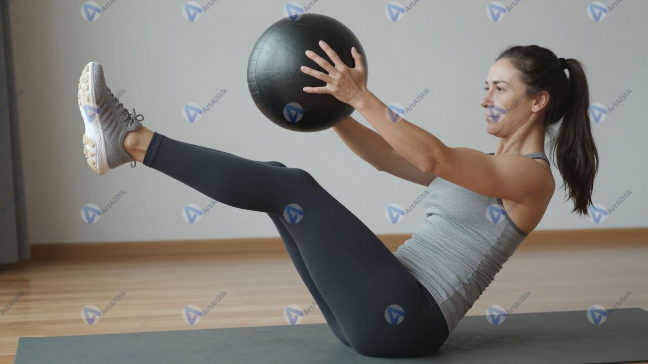 Женщина выполняет «русский твист» с медболом.