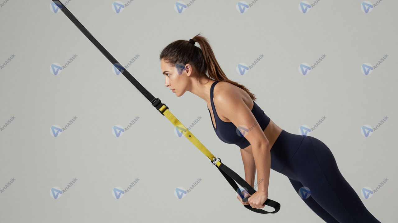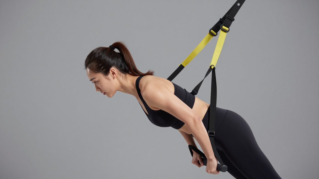 Женщина тренируется с петлями TRX, тело в наклоне.