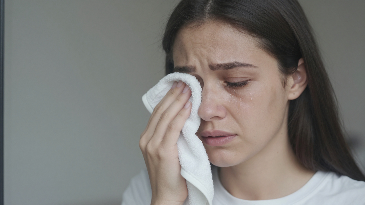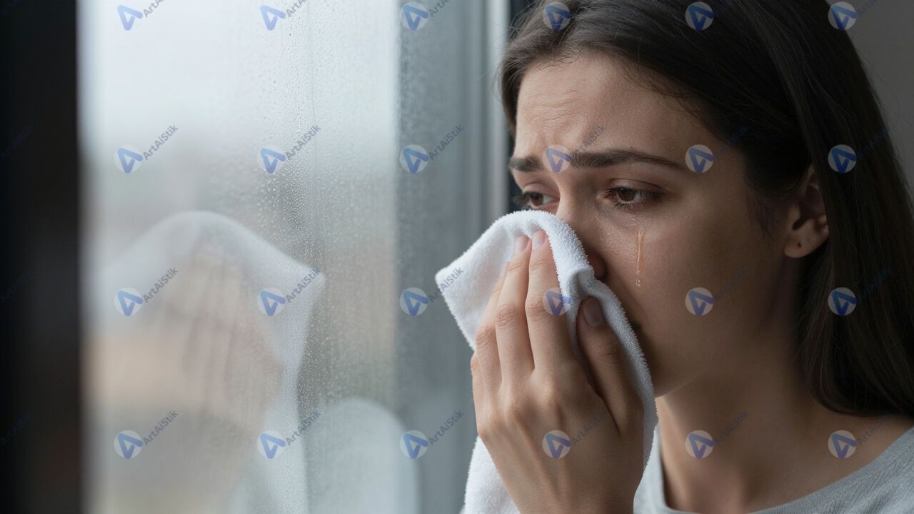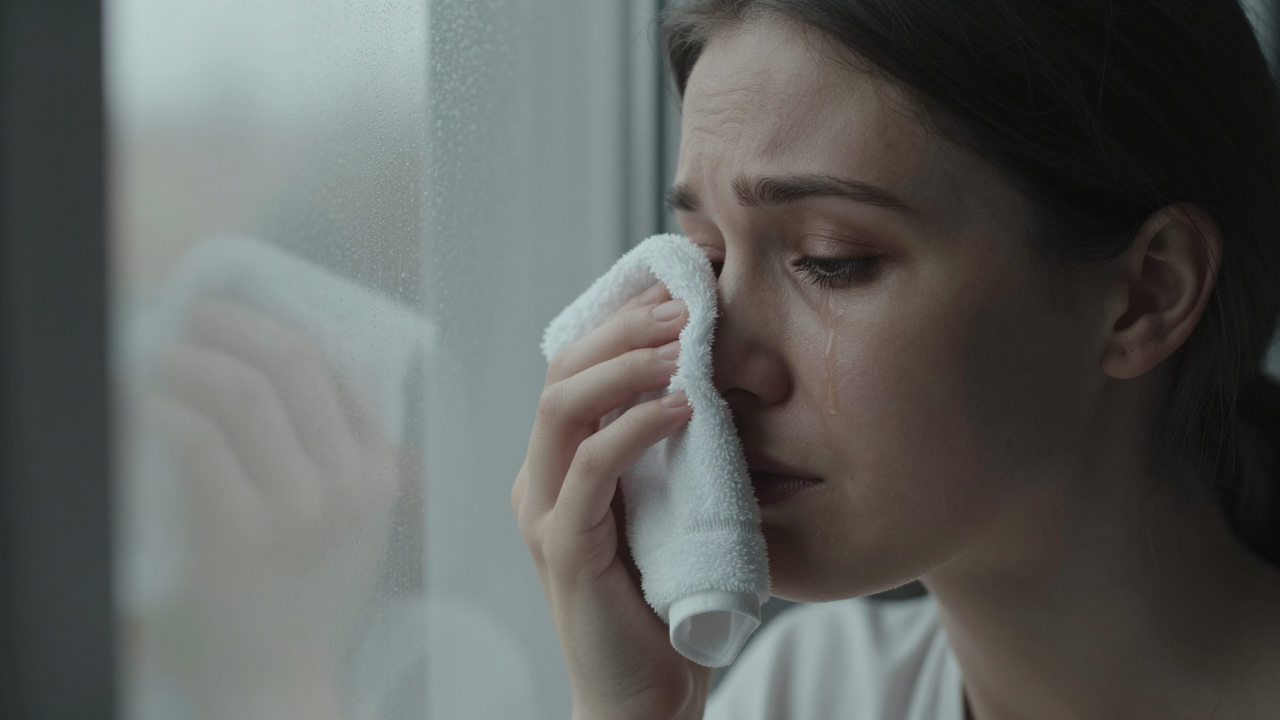 Женщина вытирает слёзу, грусть, окно.