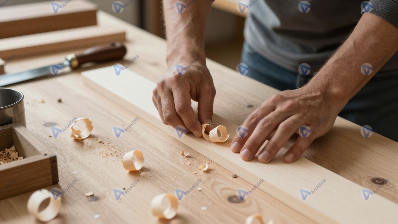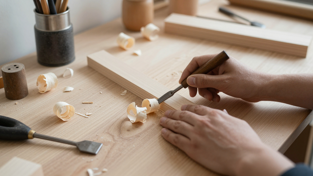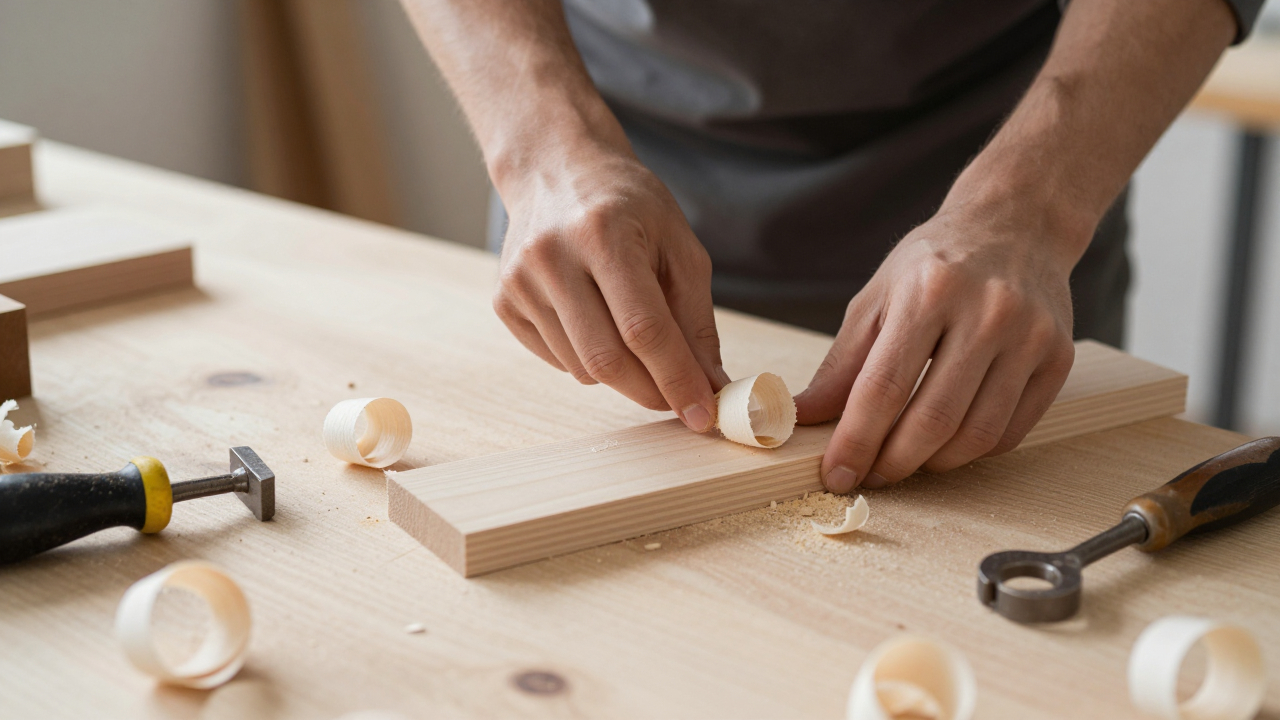 Рабочее место мастера по дереву, стружка и ручные инструменты.