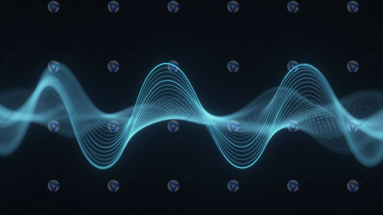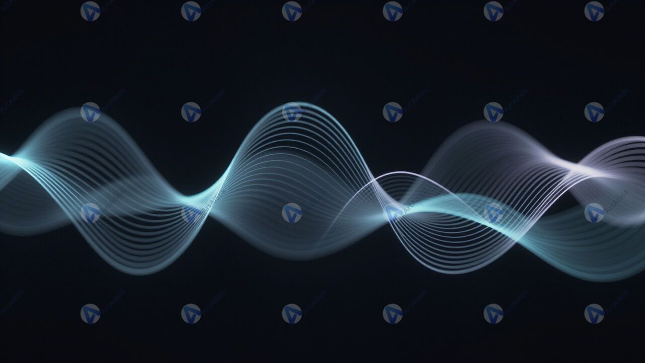 Абстрактная цифровая волна из светящихся линий на тёмном фоне.
