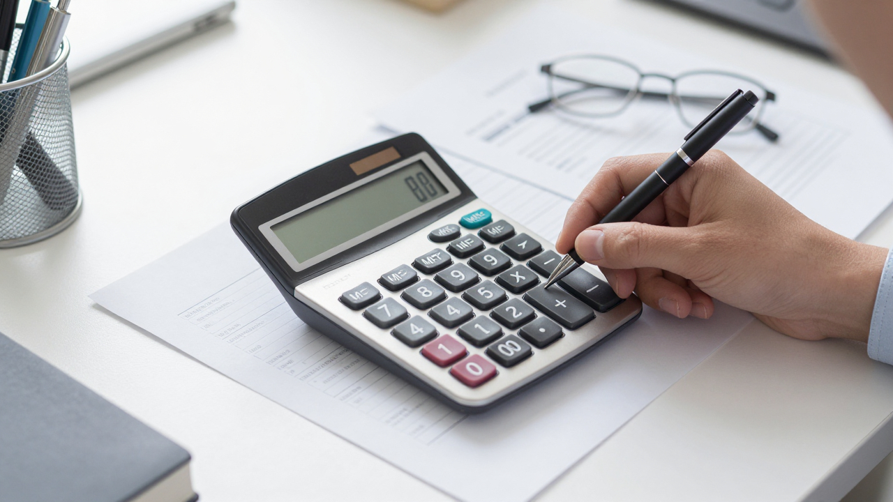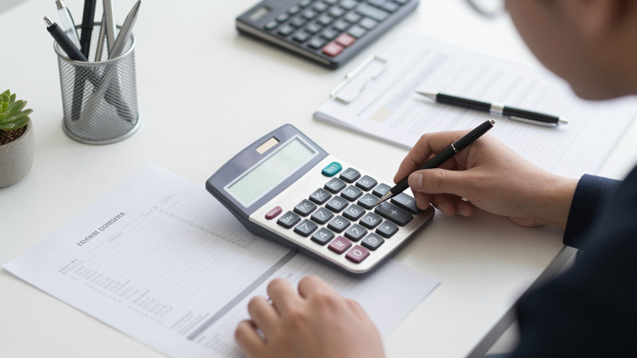 Рабочее место бухгалтера: калькулятор, отчёты, стакан с ручками.