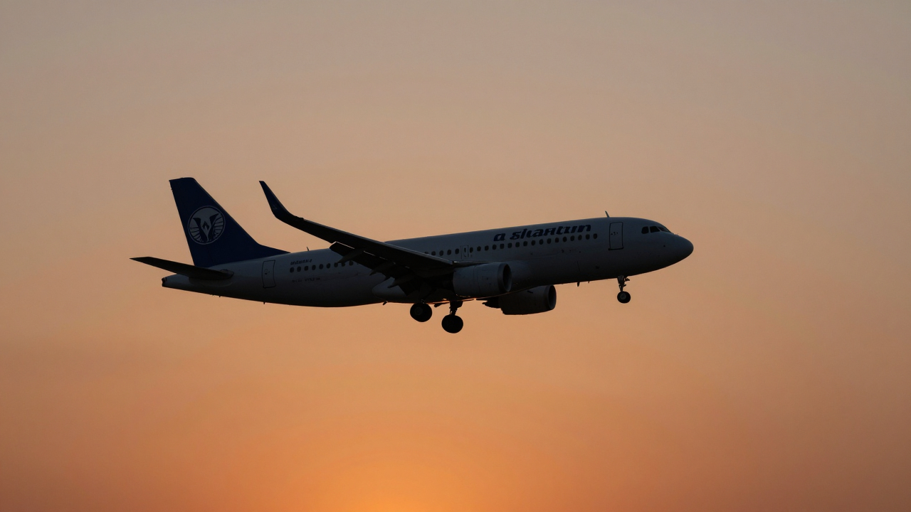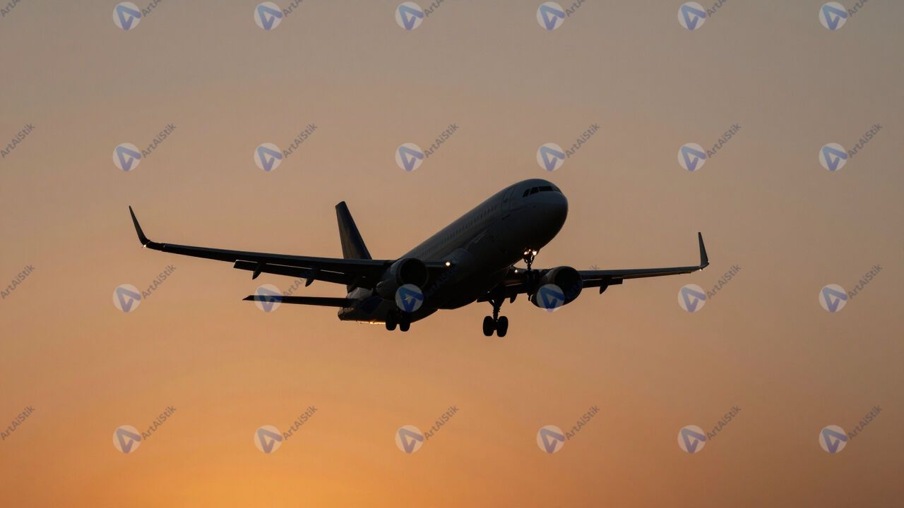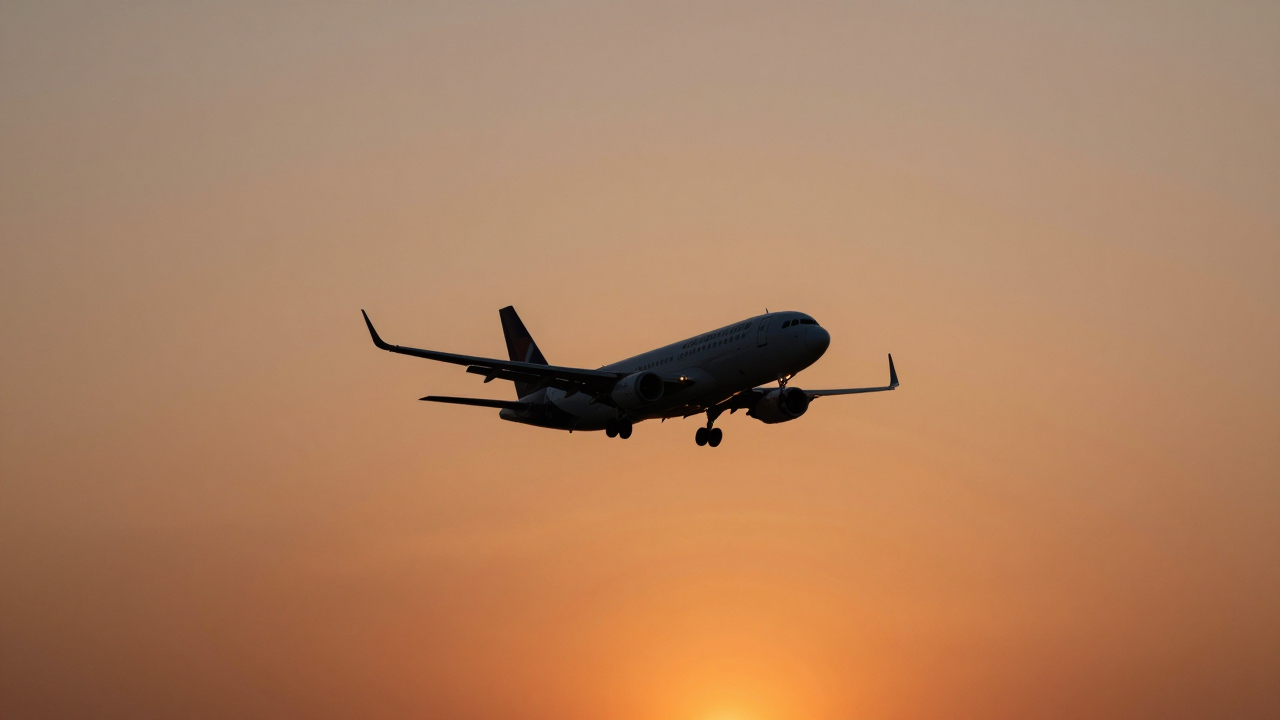 Самолёт на фоне заката, силуэт на оранжевом небе.