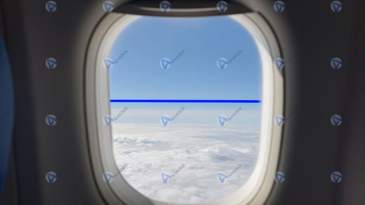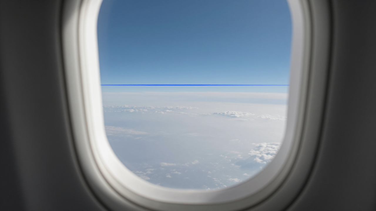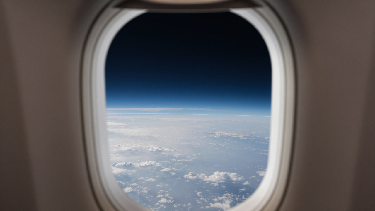 Иллюминатор самолёта, видна тонкая голубая линия атмосферы.