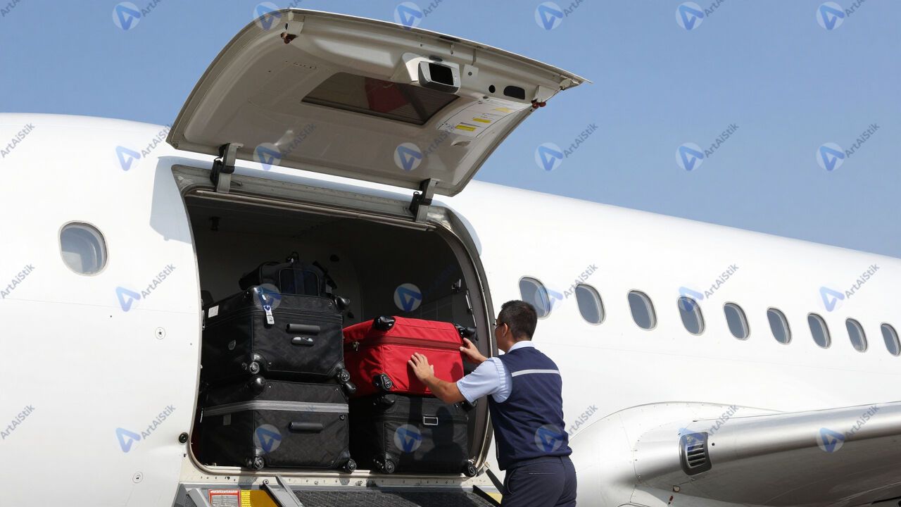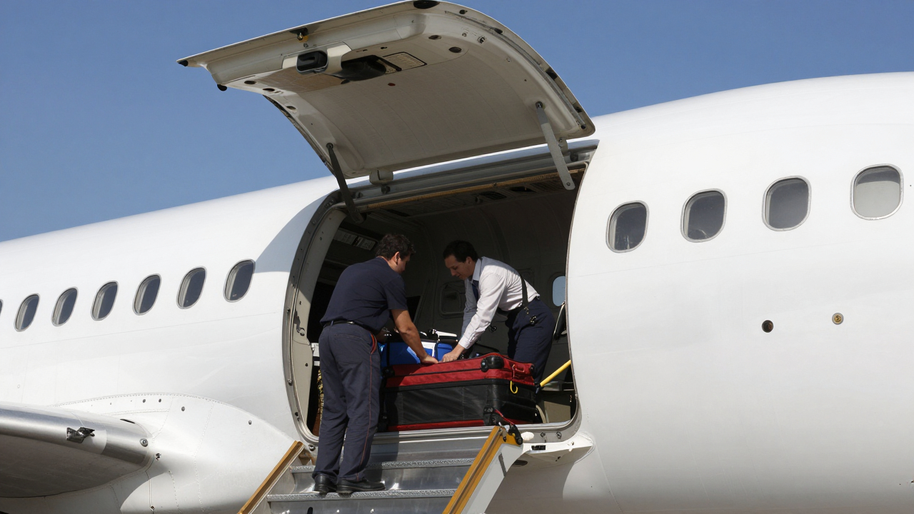 Самолёт с открытым грузовым люком, погрузка багажа.