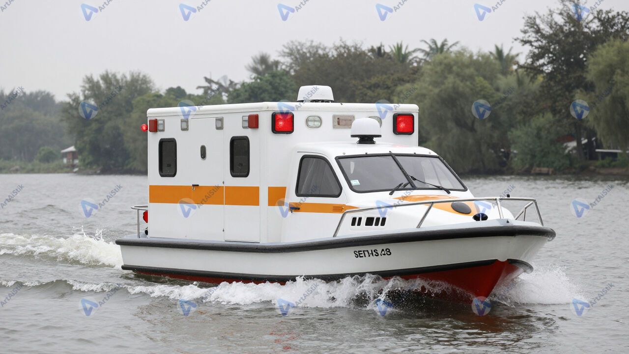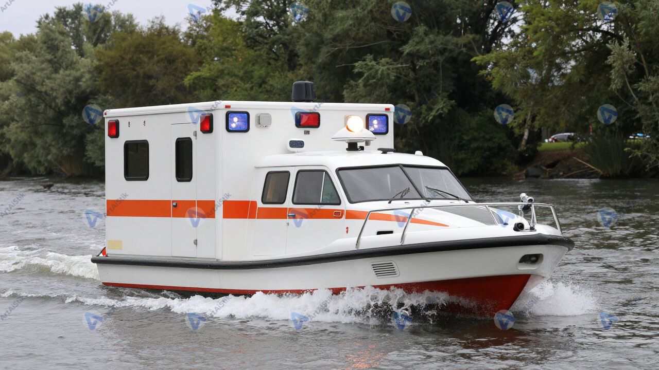 Катер скорой помощи с сиреной мчится по реке.