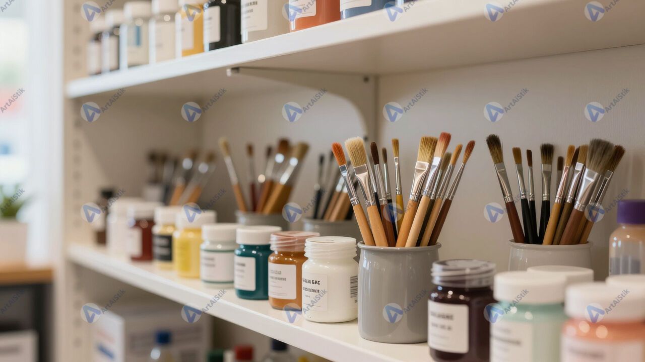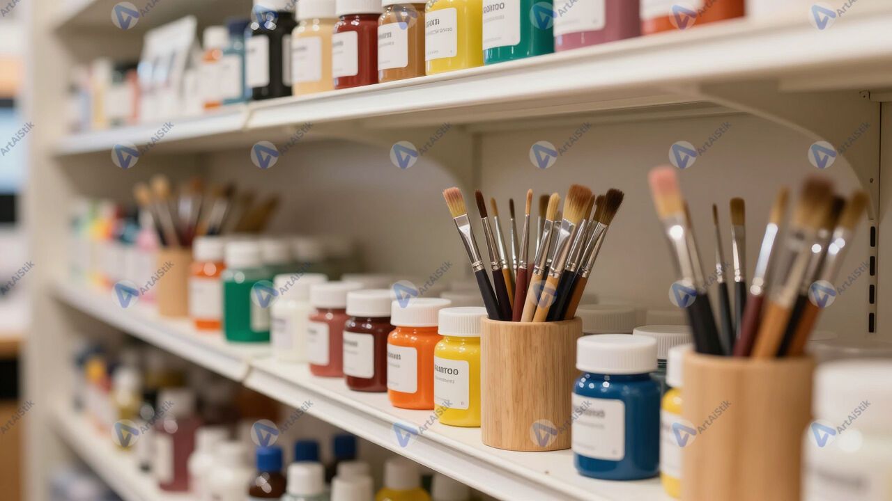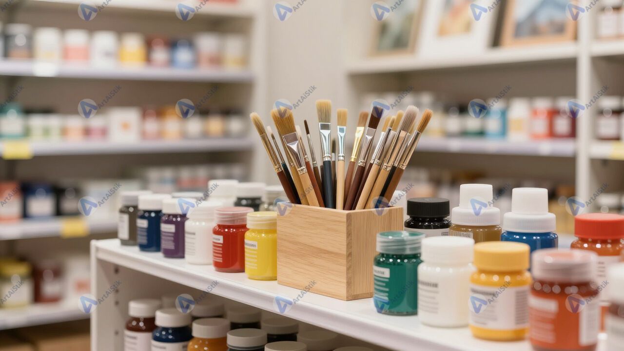 Витрина художественного магазина с кистями и красками.