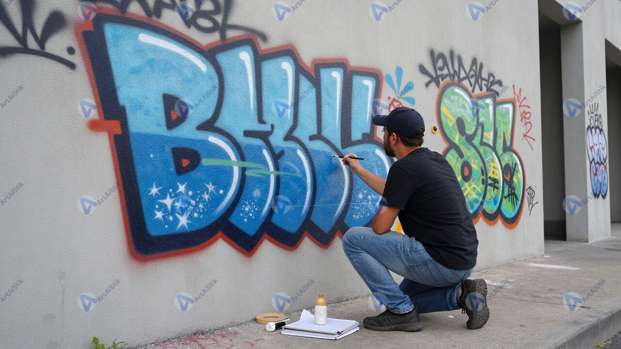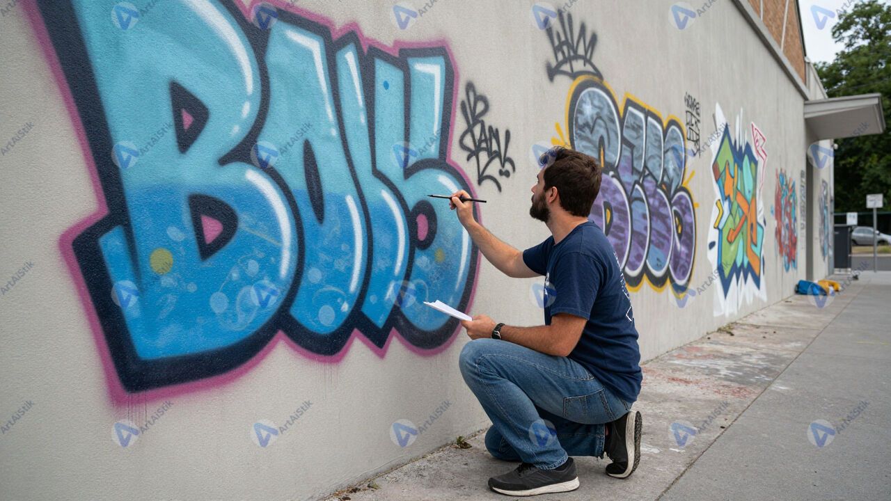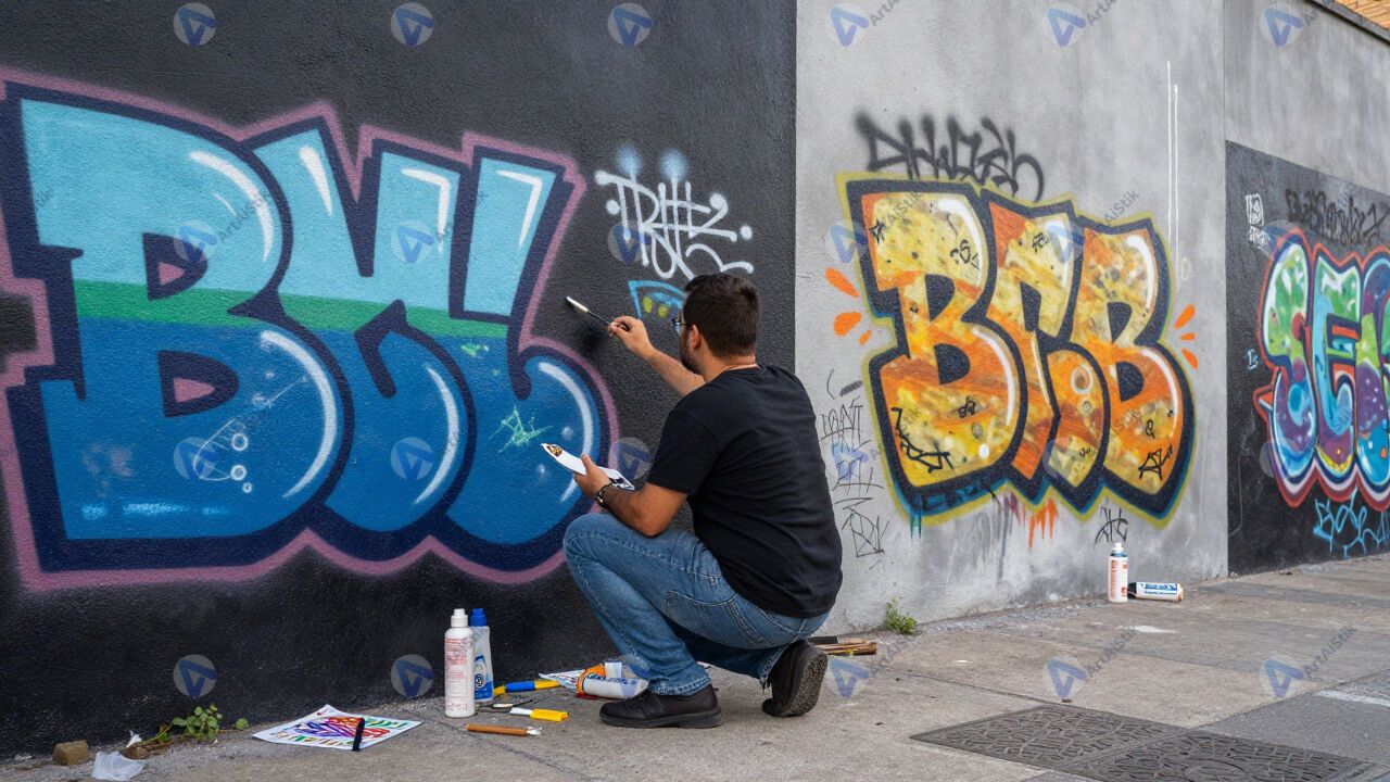 Художник рисует граффити на стене в разрешённом пространстве.