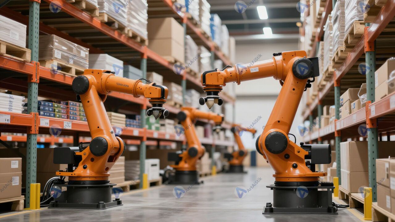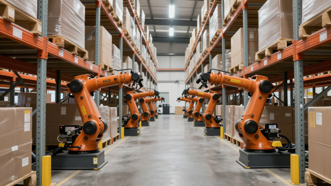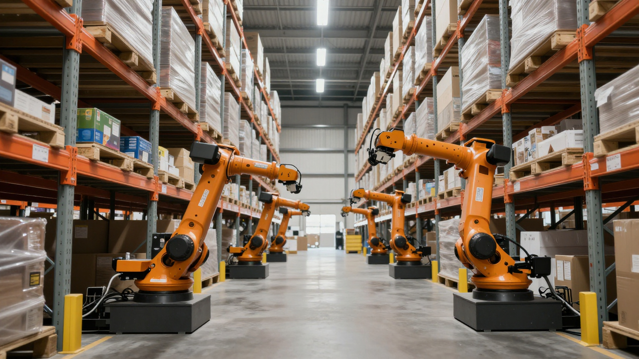 Автоматизированный склад, роботы перемещают высокие стеллажи.