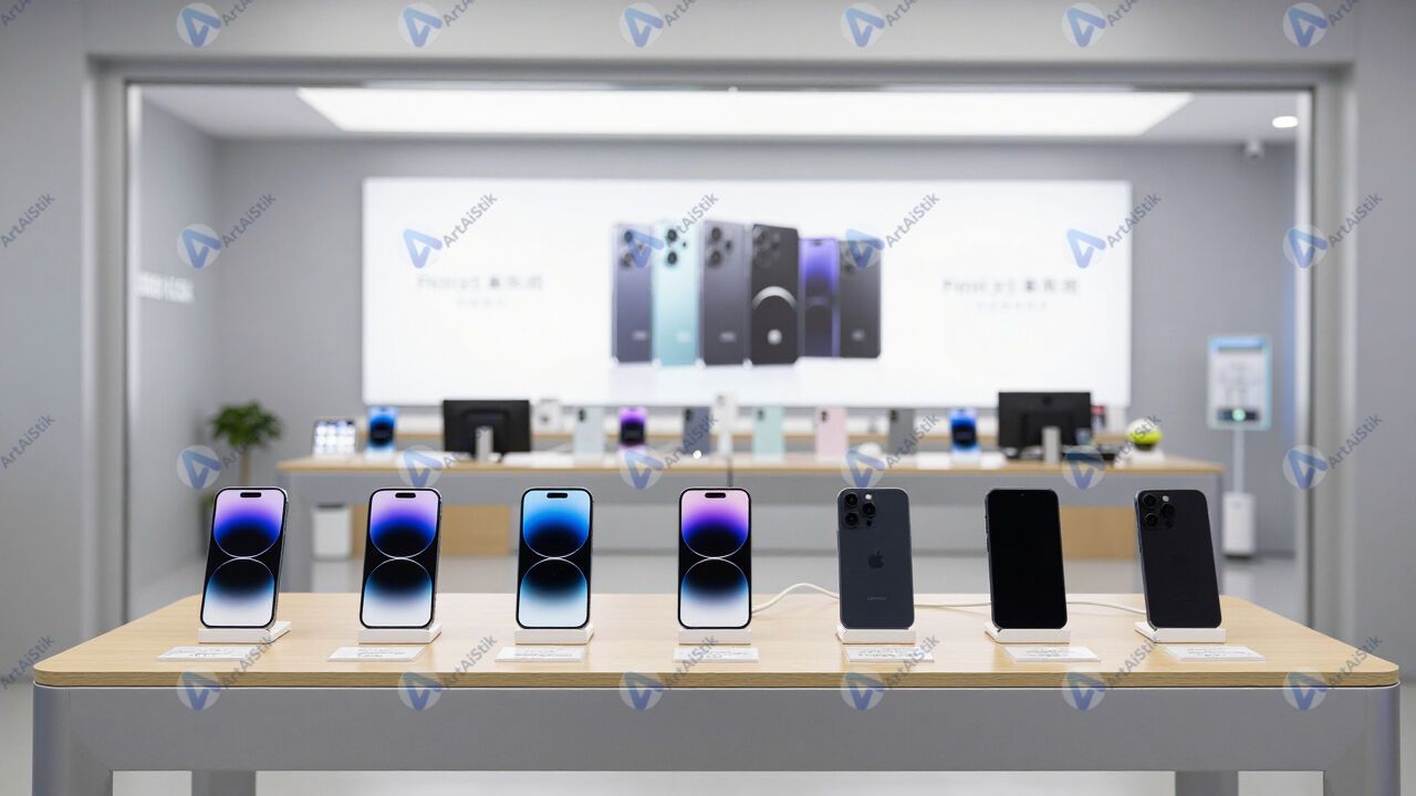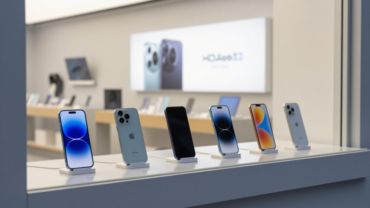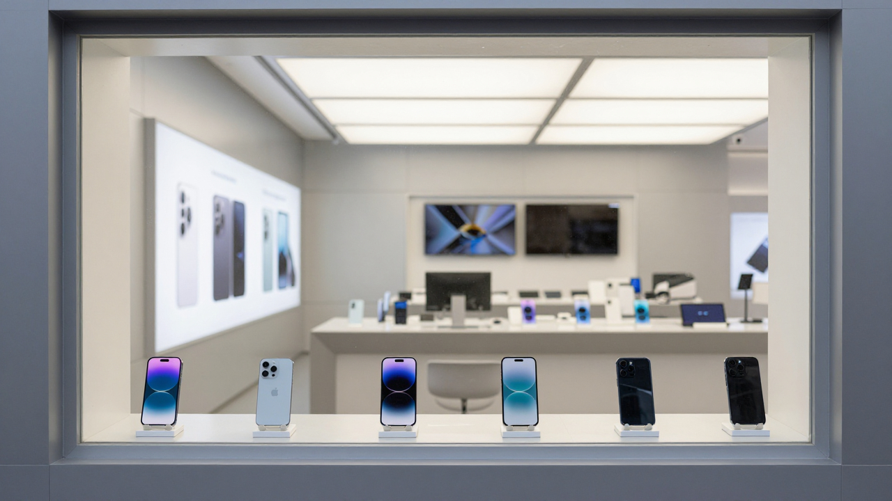 Витрина магазина электроники, ряд смартфонов на подставках.