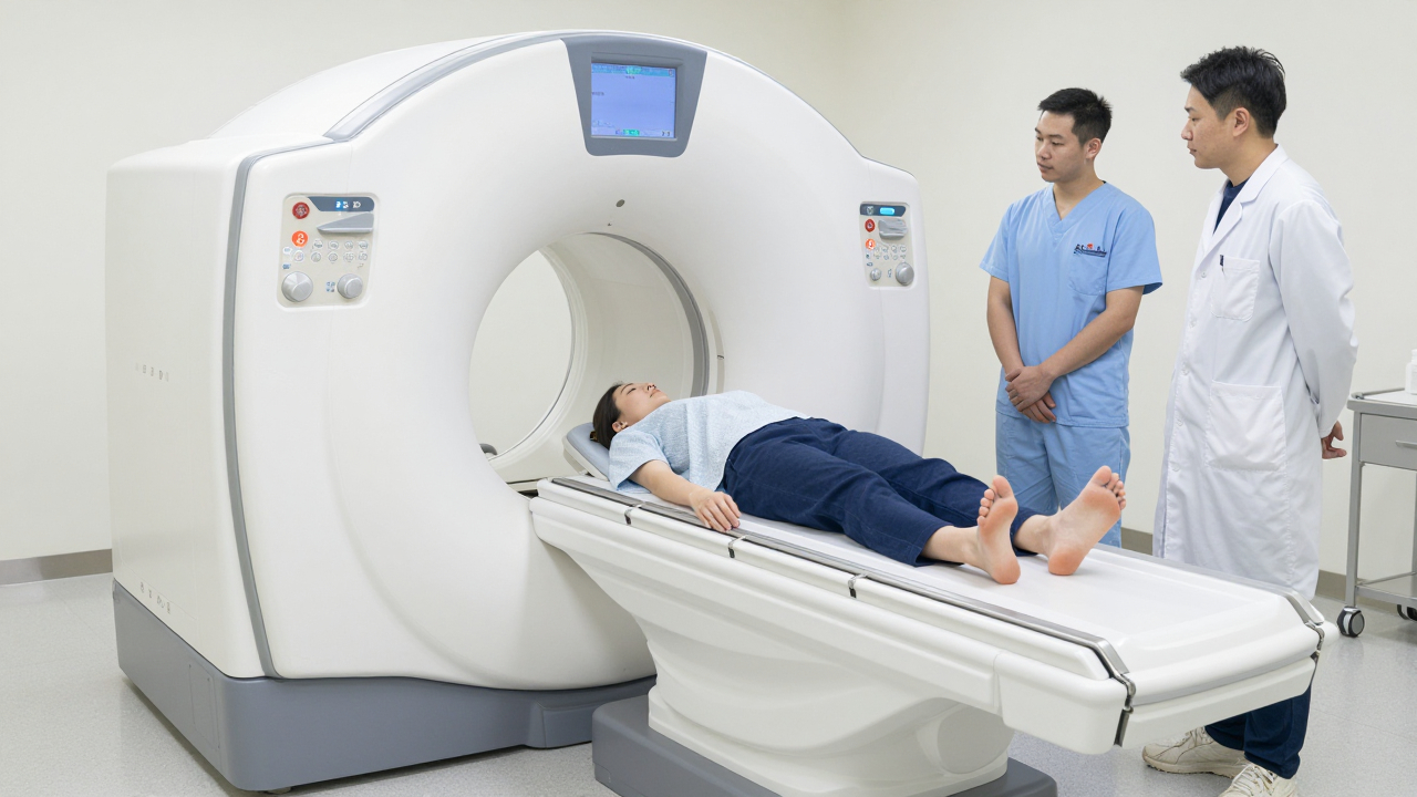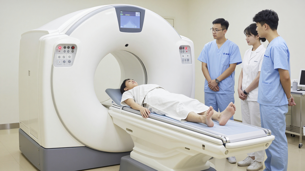 Аппарат МРТ, пациент въезжает в тоннель, медперсонал рядом.