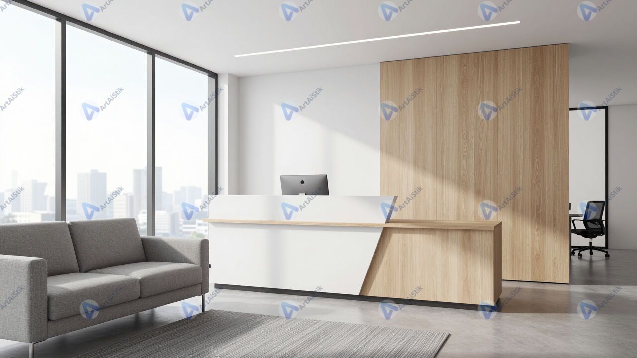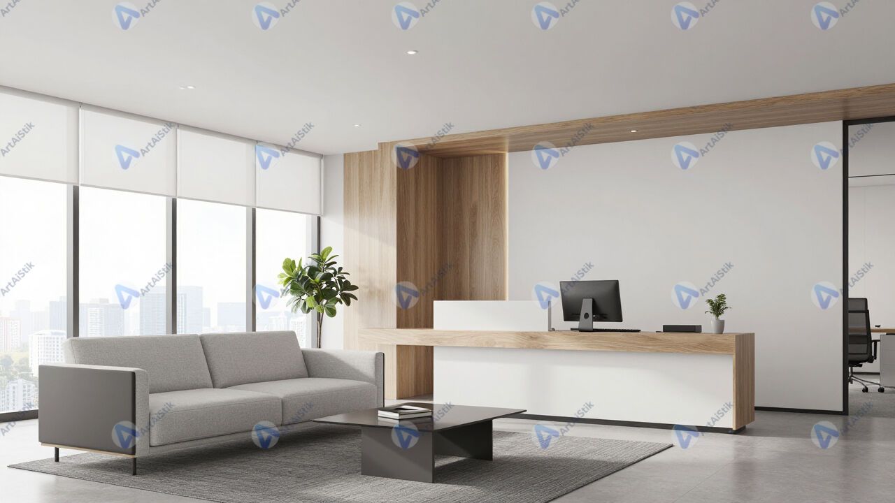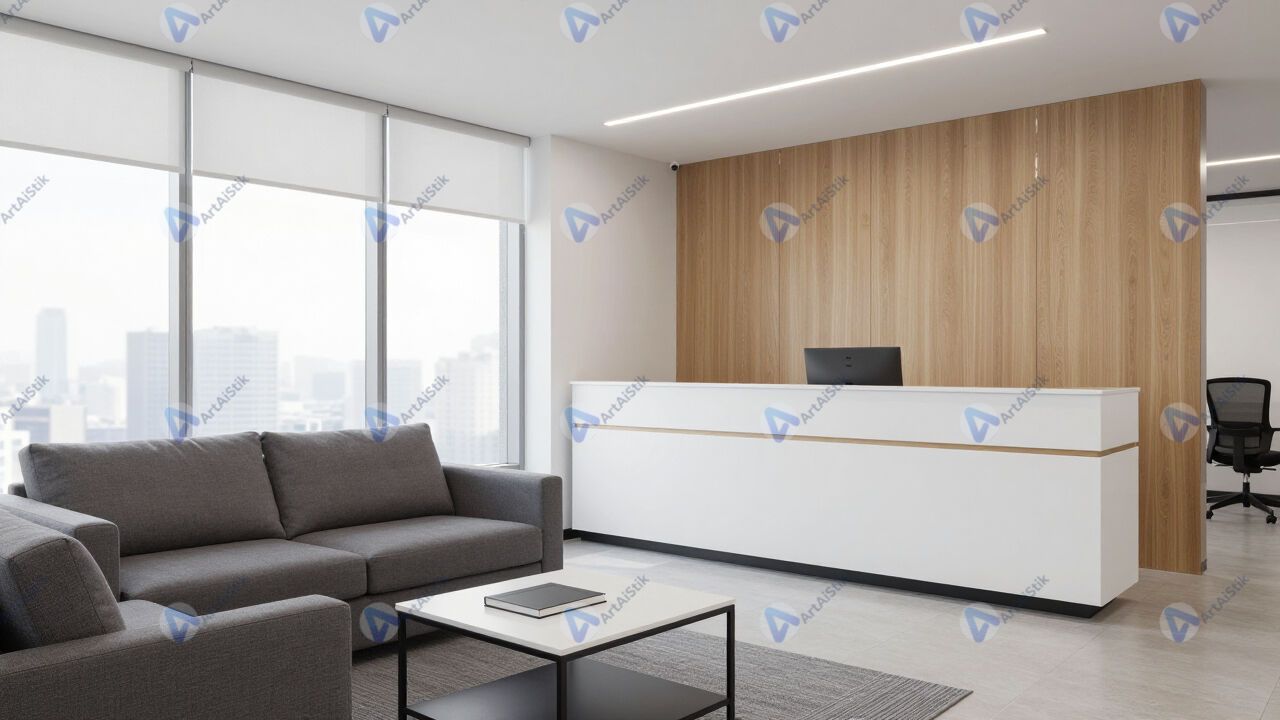 Приёмная офиса с диваном и стойкой ресепшен.
