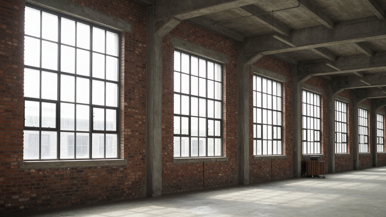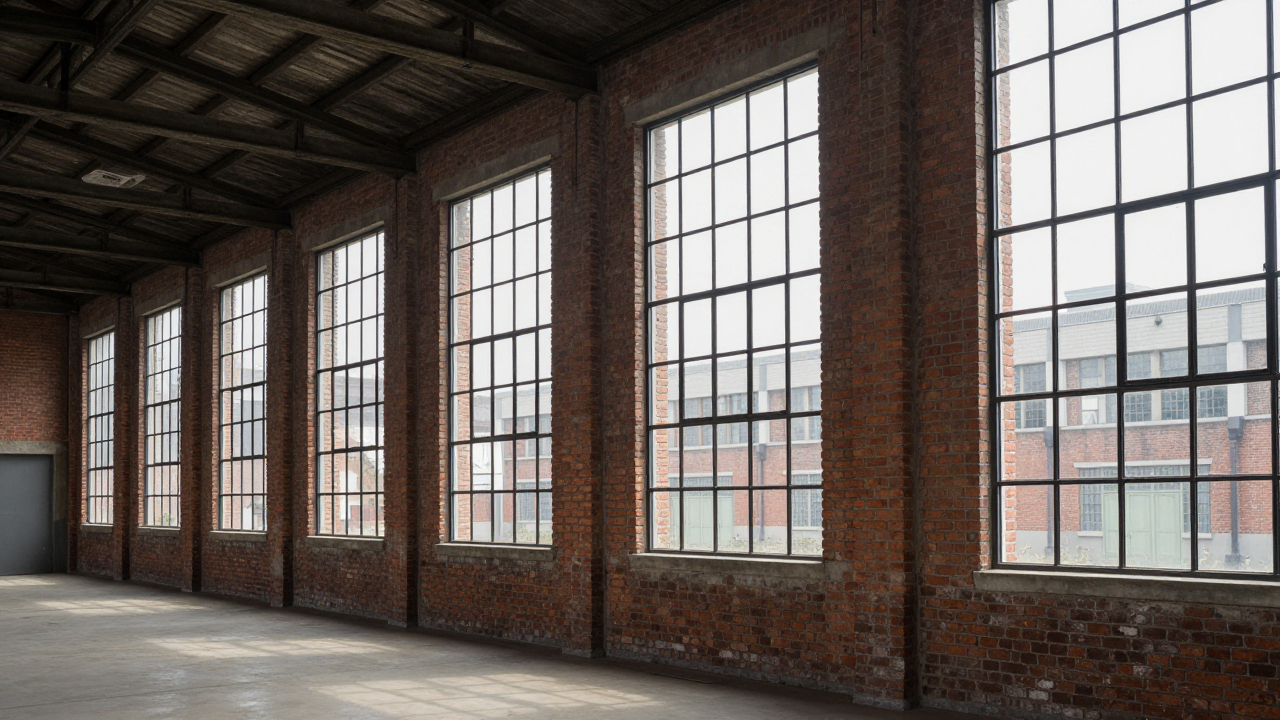 Старый кирпичный склад, большие окна, индустриальный стиль.