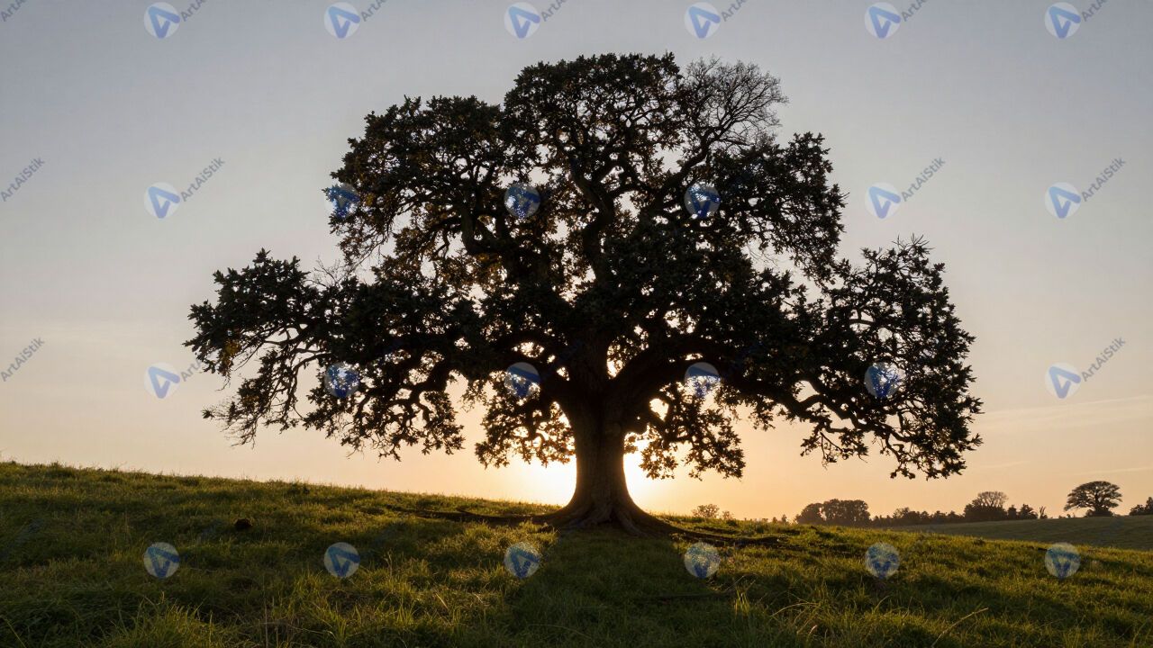 Старый дуб на холме, раскидистая крона, закат за спиной.