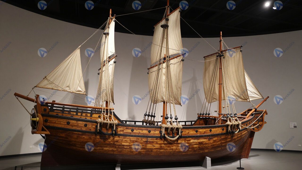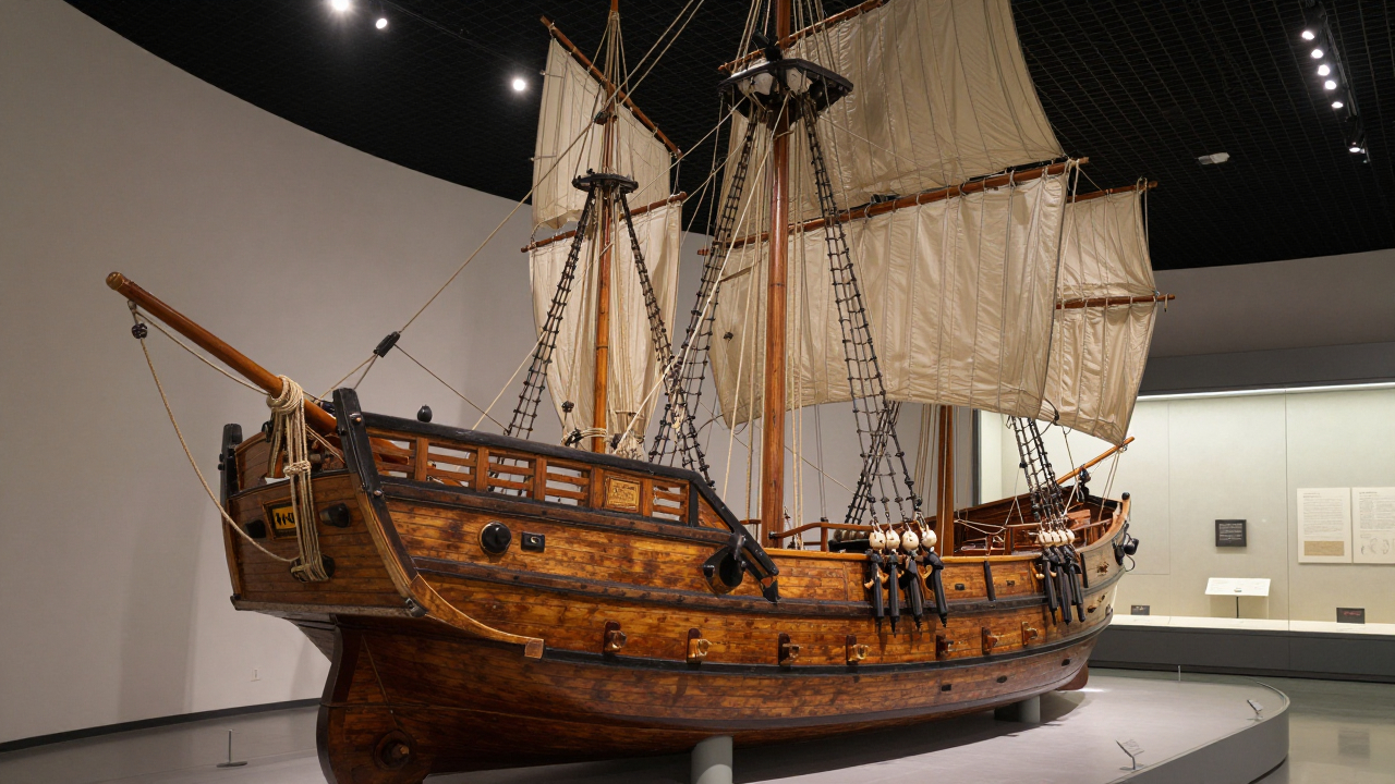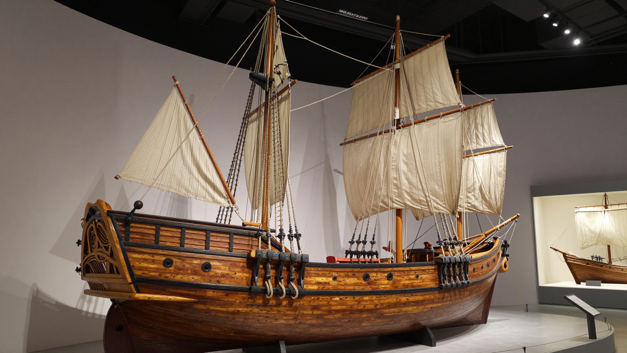 Старый деревянный корабль с канатами и парусами, музейная экспозиция.