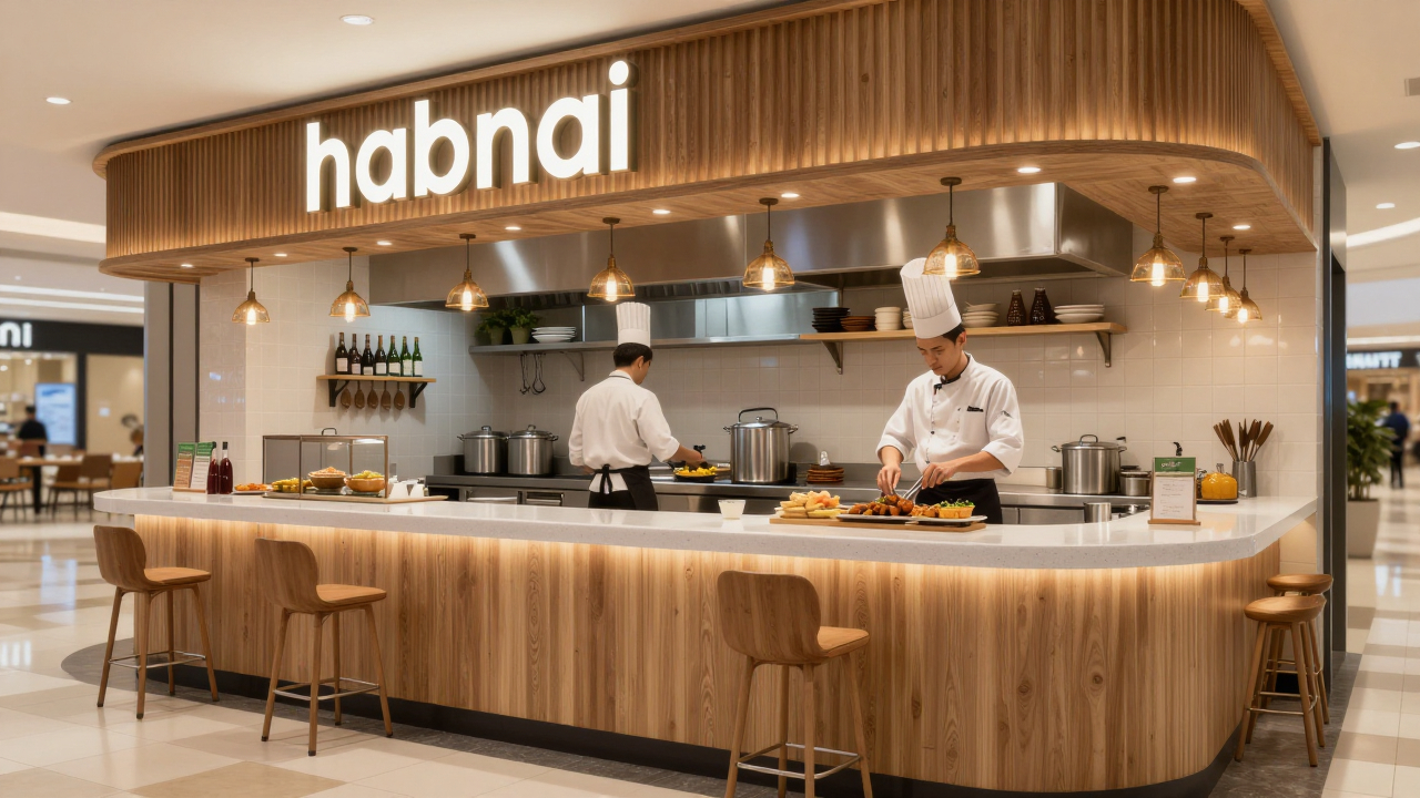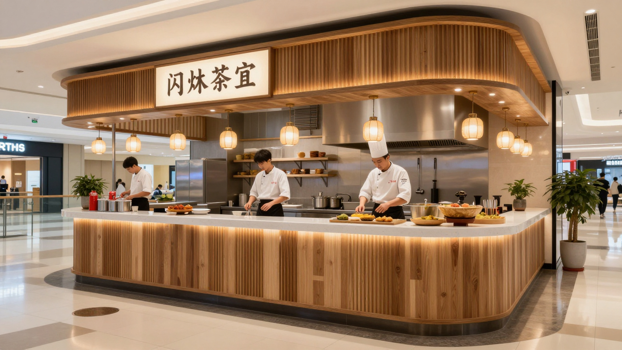 Ресторан открытой кухни в торговом центре, стойка и повара.