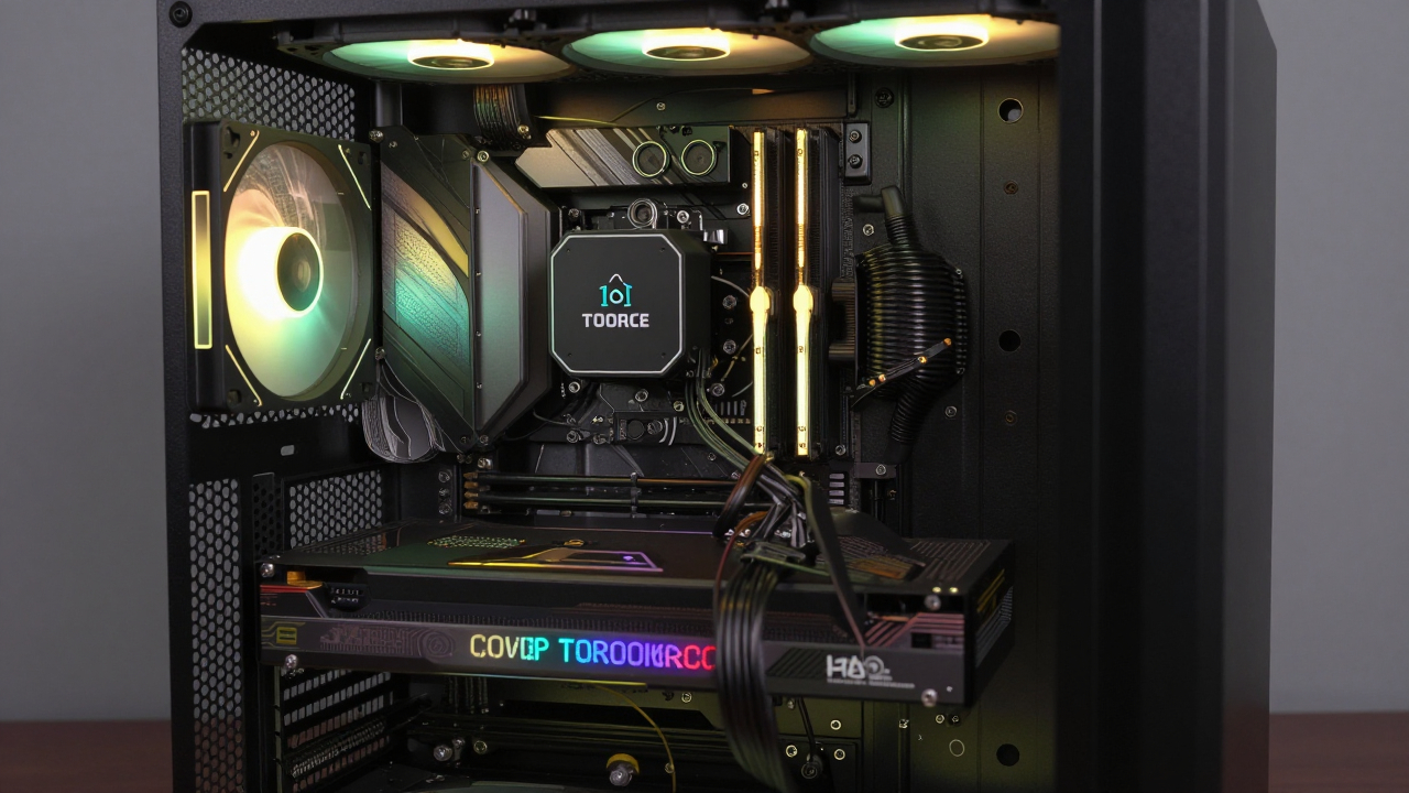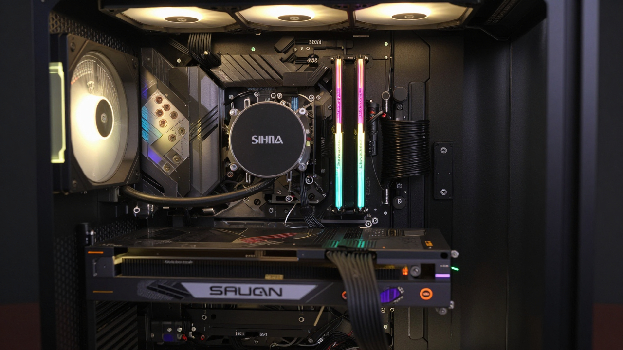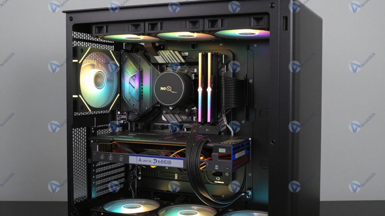 Открытый системный блок, видны компоненты и RGB‑подсветка.
