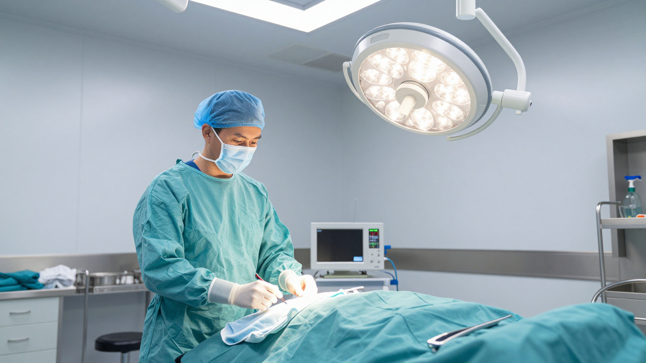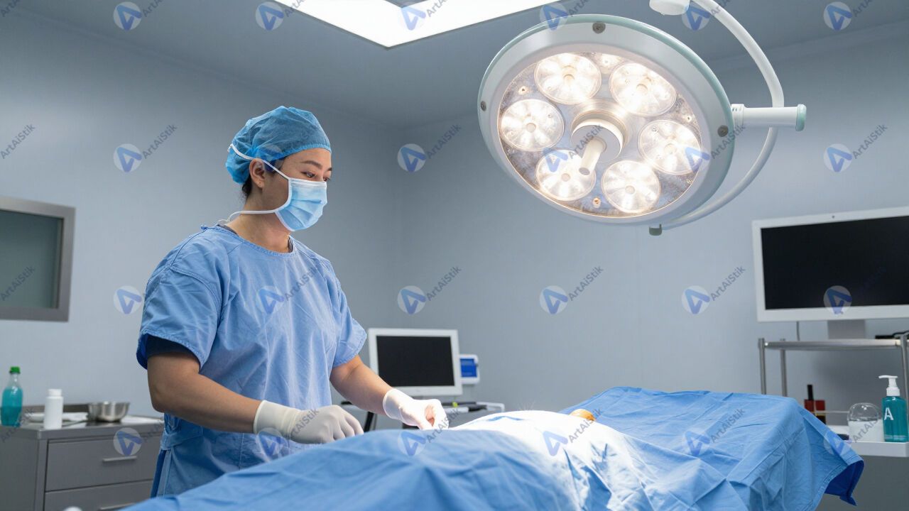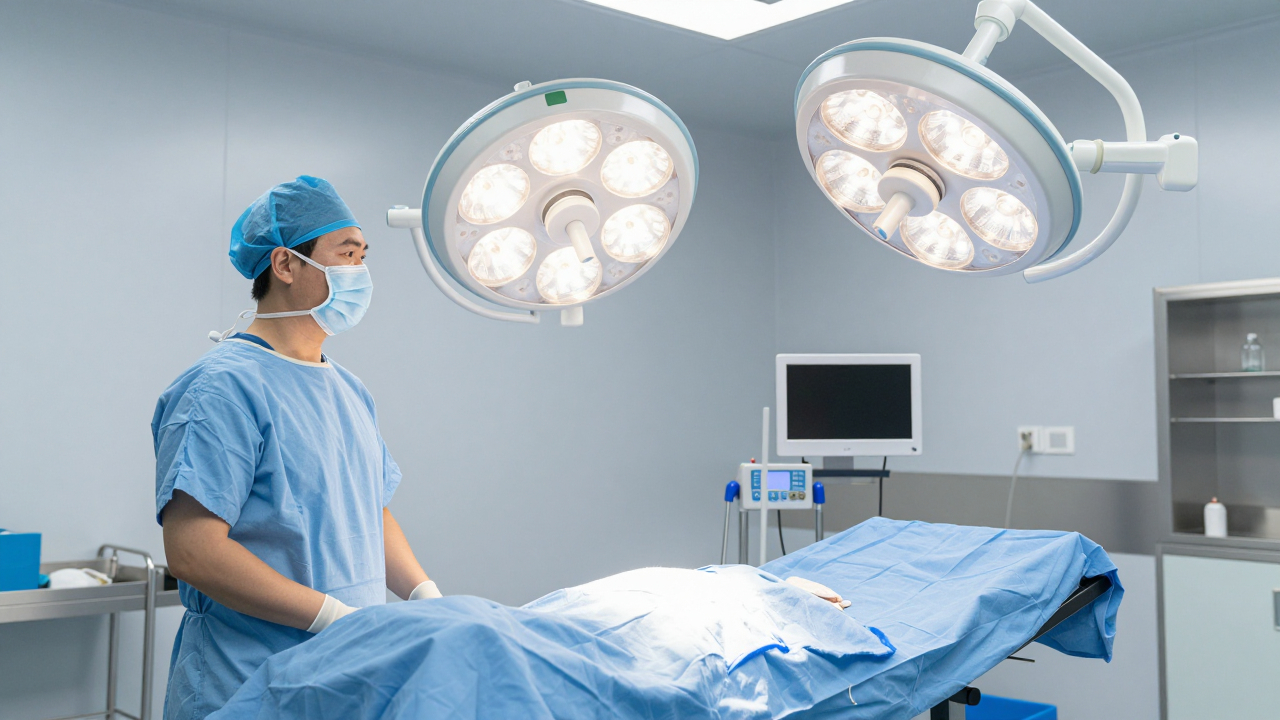 Операционная, хирургическая лампа и накрытый стол.
