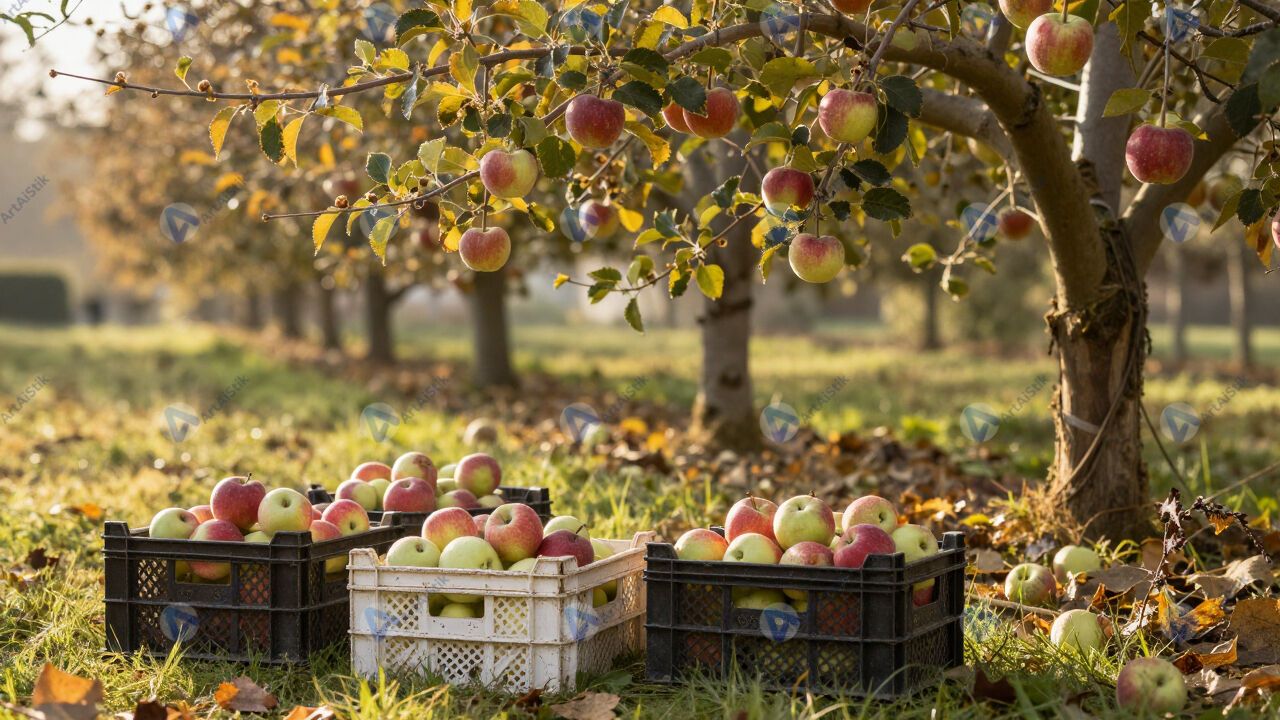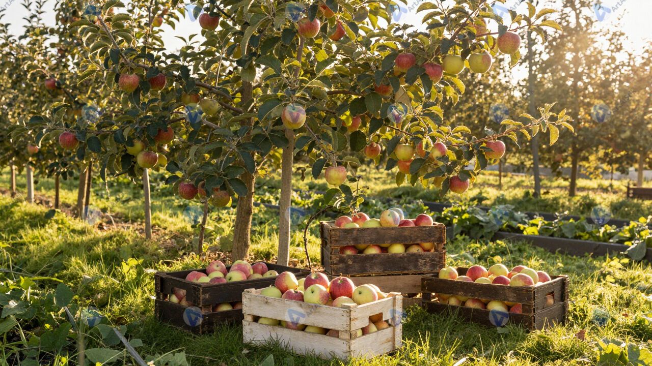 Урожай яблок осенью, ящики, сад, утро.