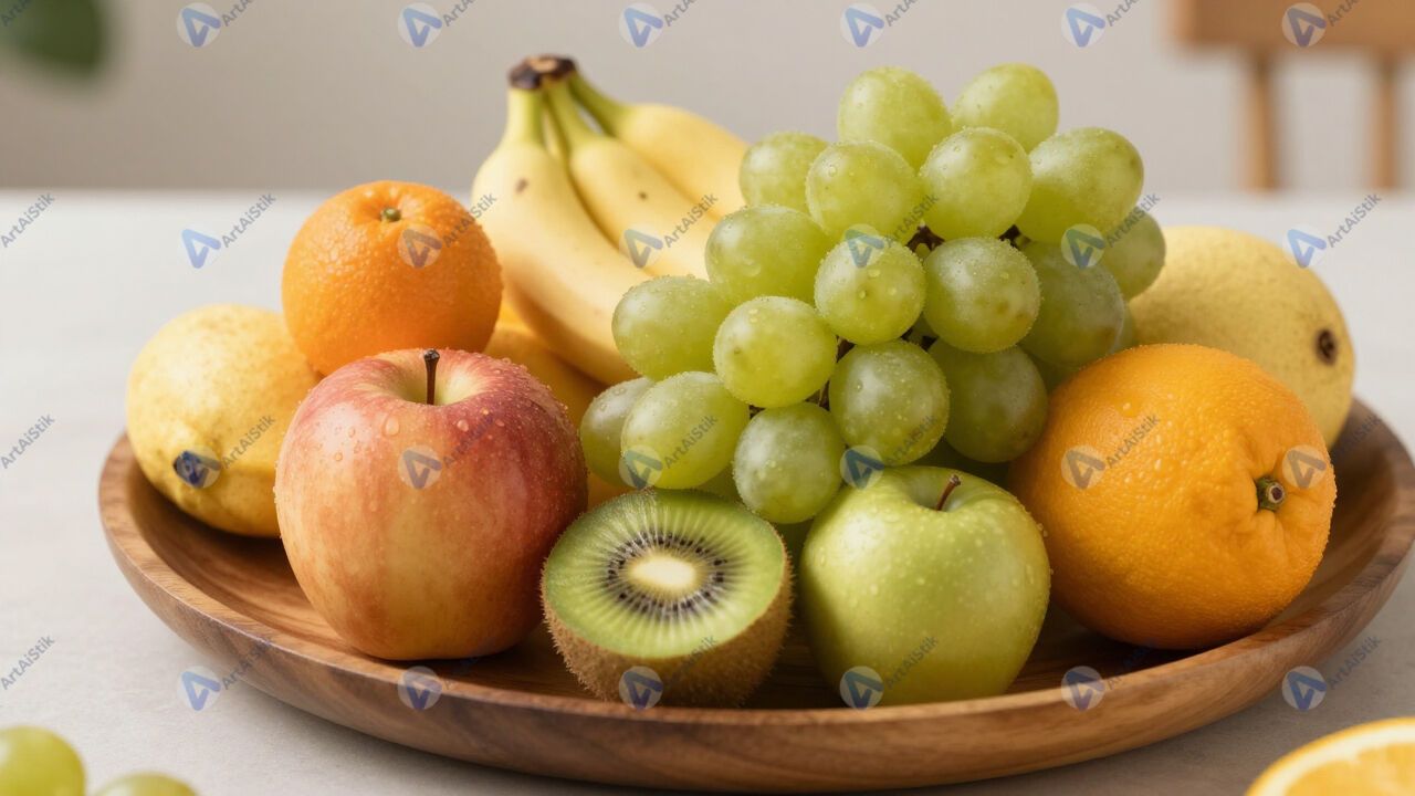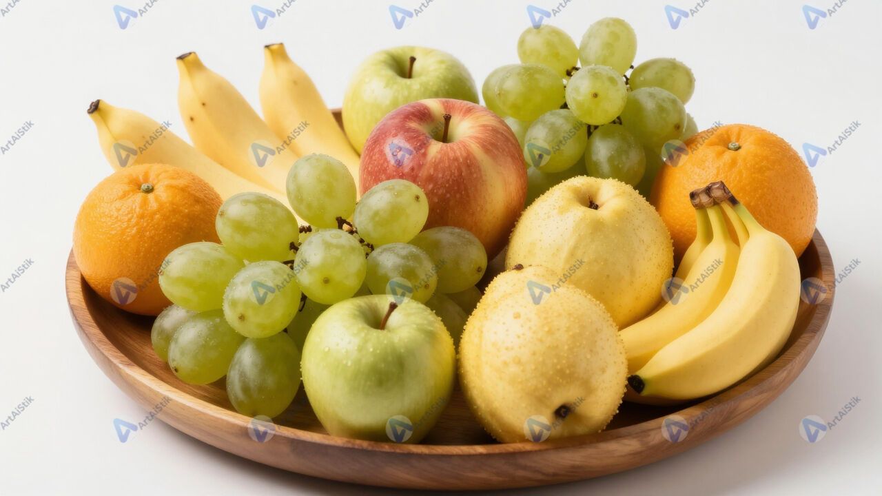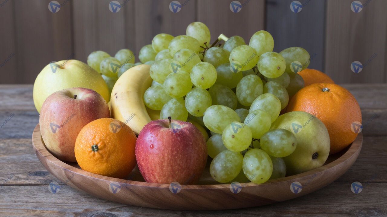 Фруктовое ассорти на большом деревянном блюде.