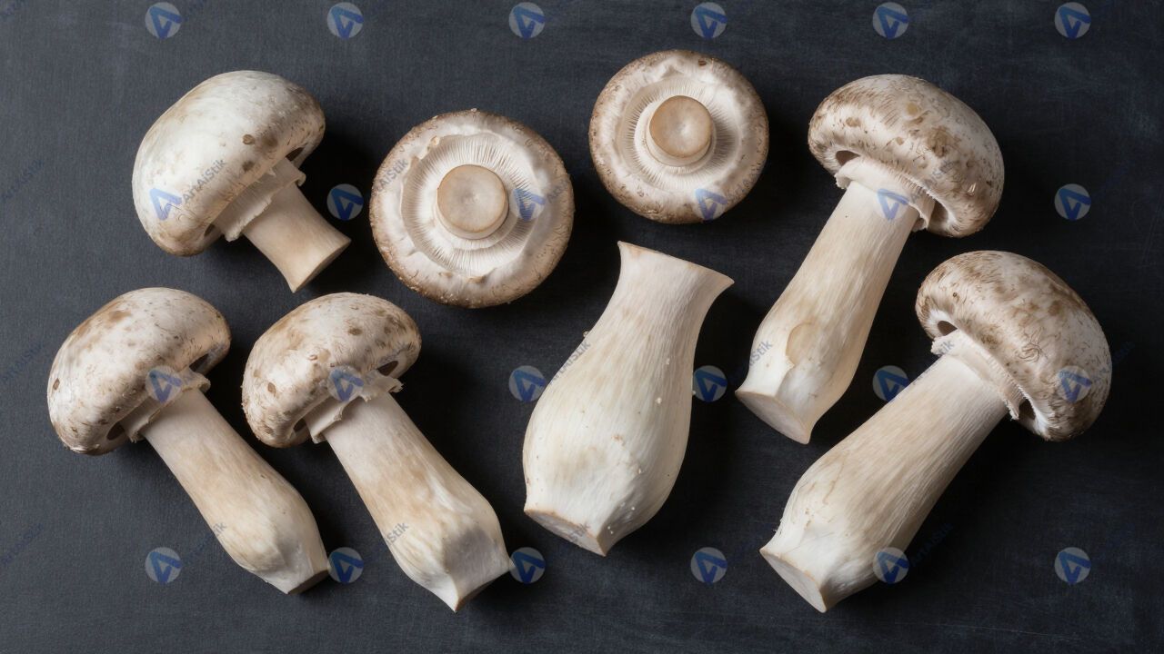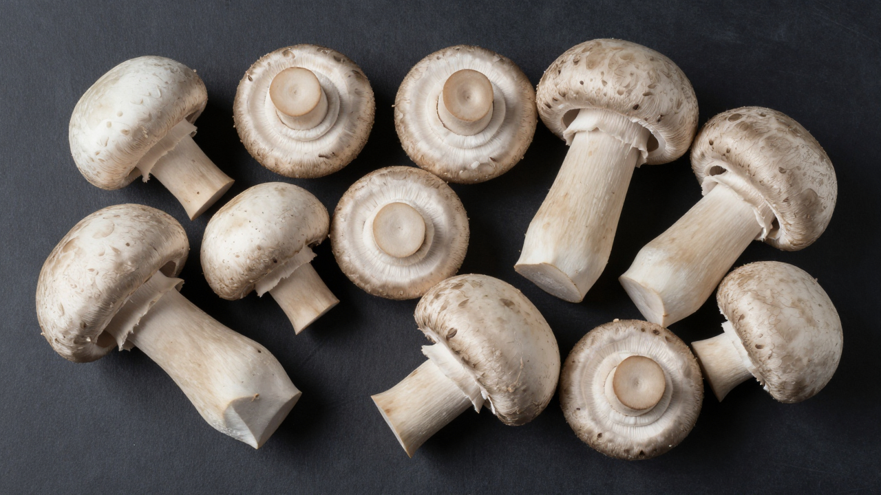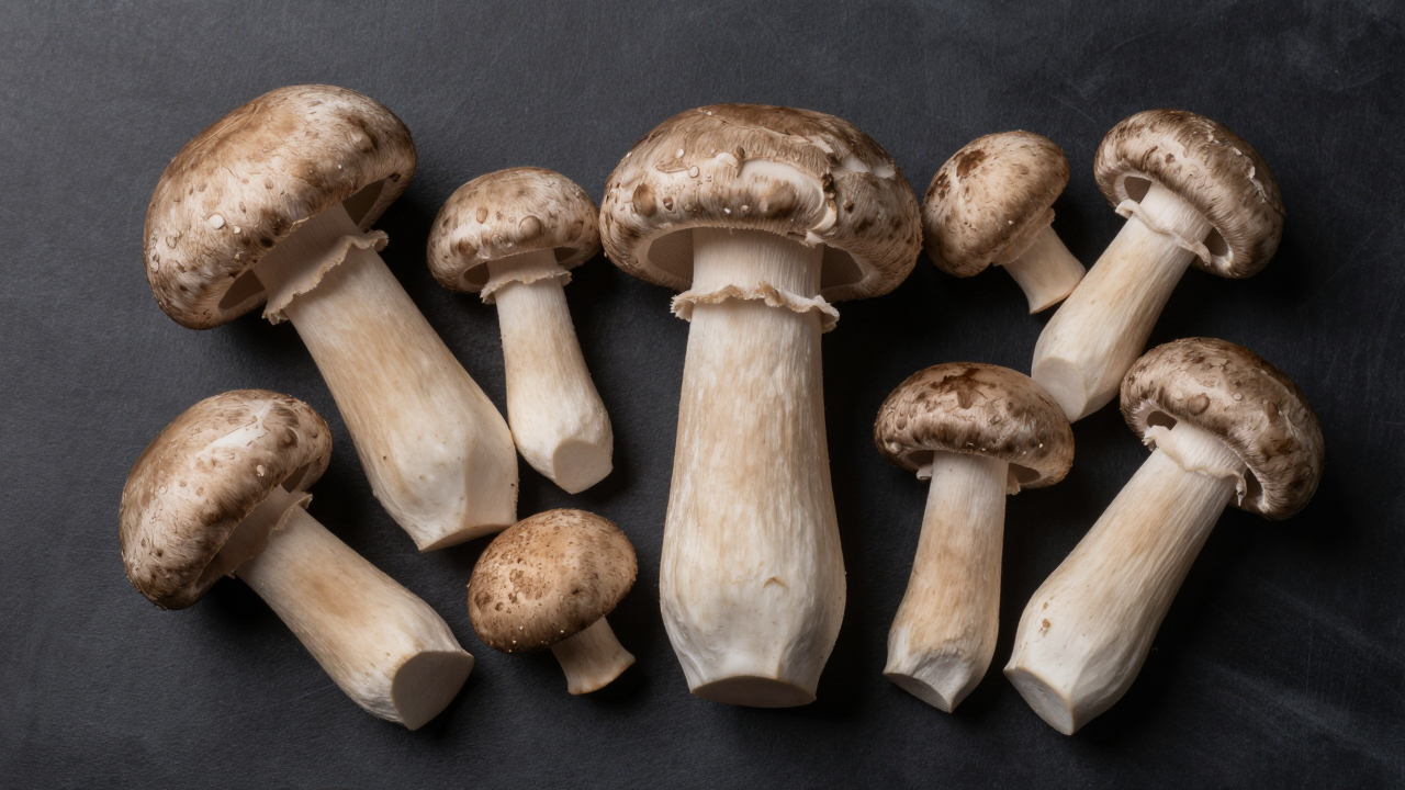 Ассорти грибов на чёрной доске, сырые шляпки.