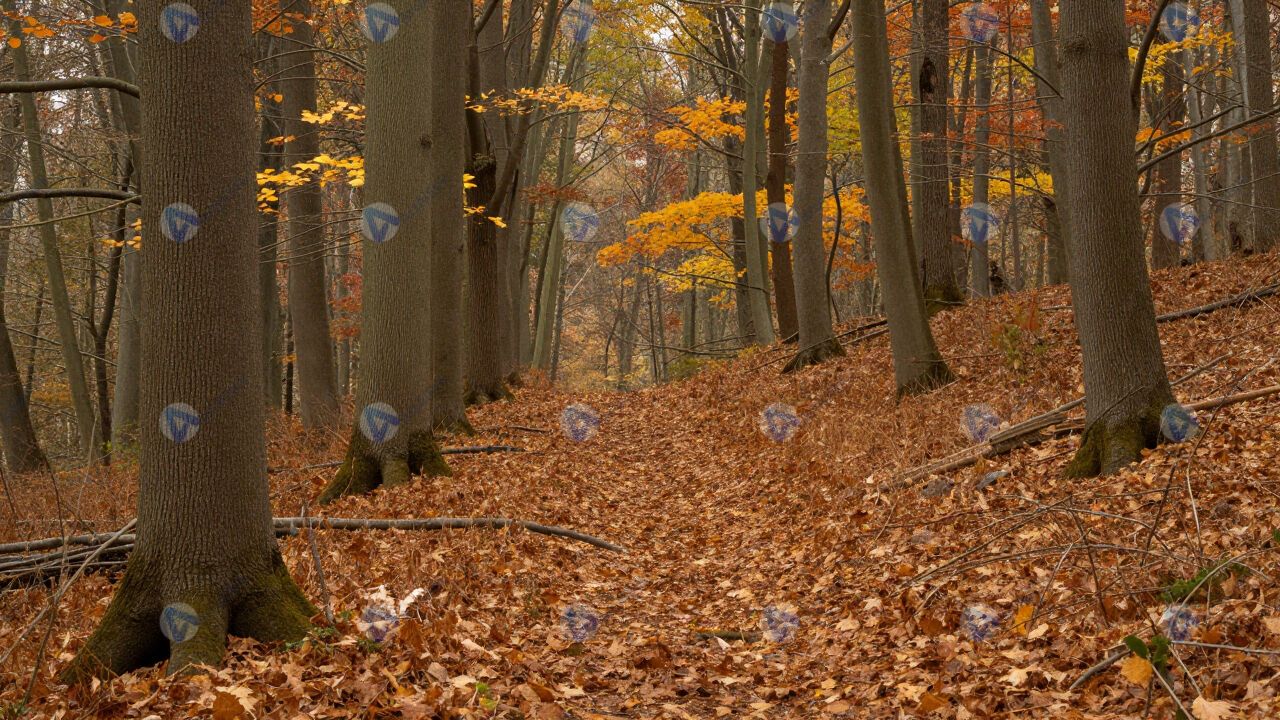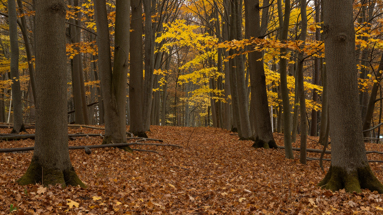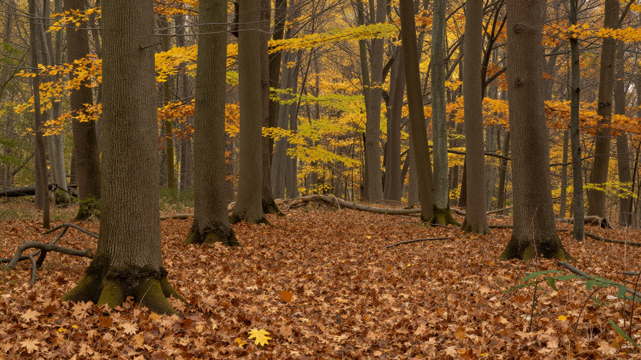 Осенний лес, ковёр из листьев, стволы деревьев.