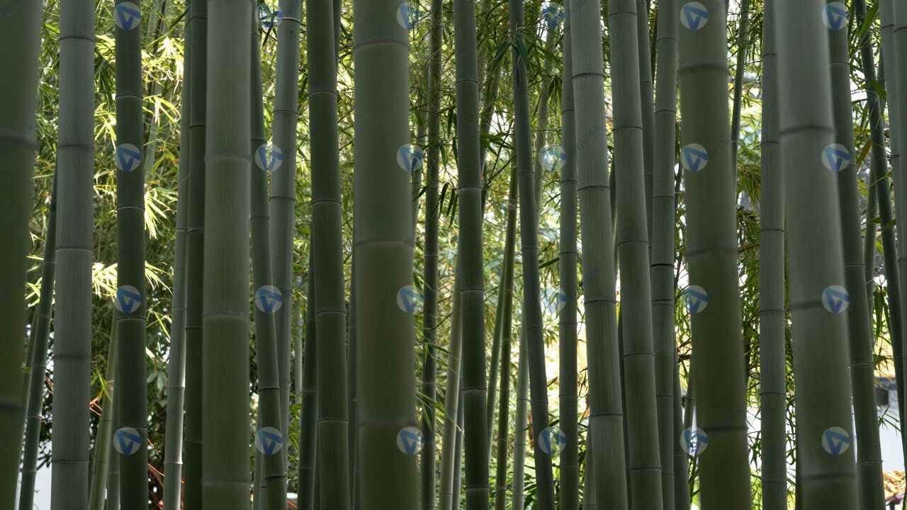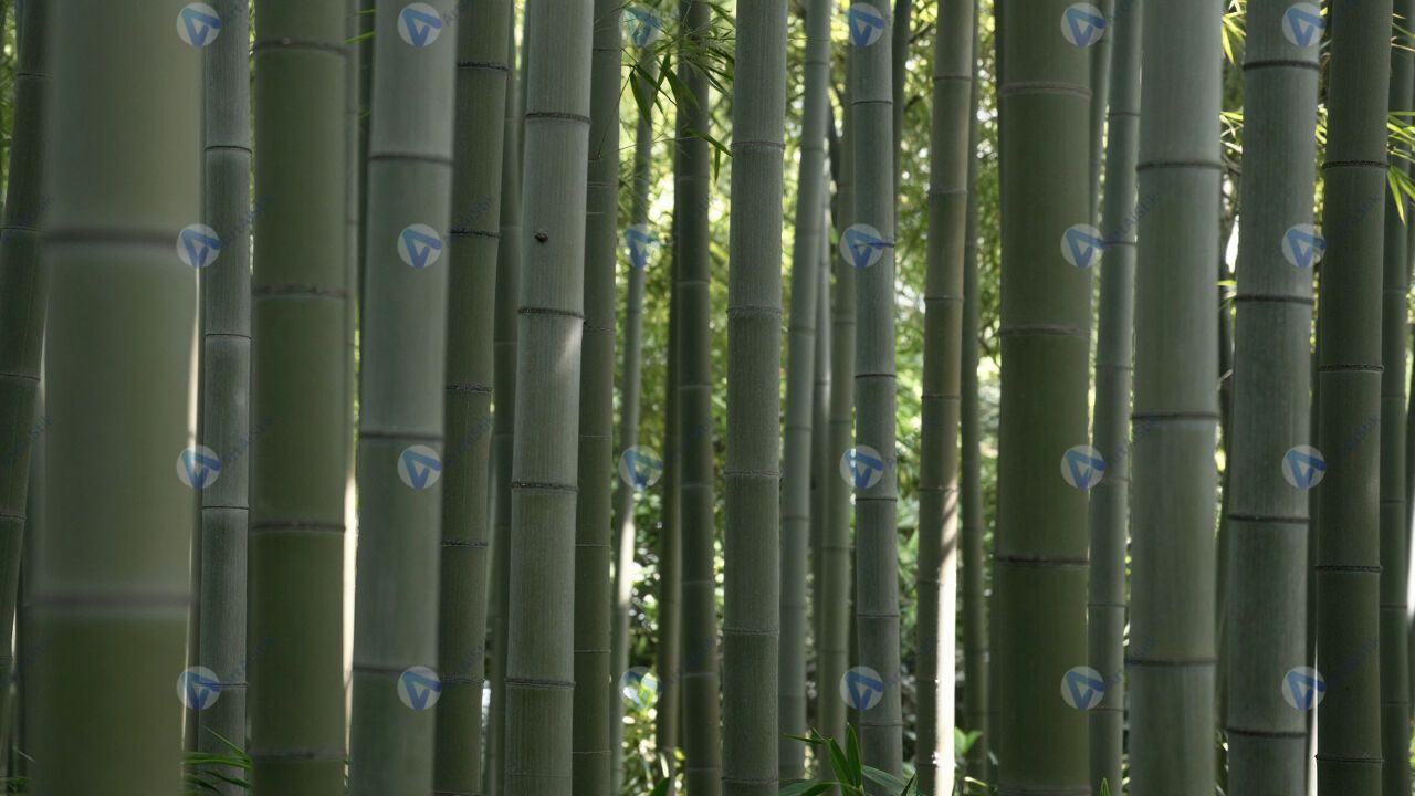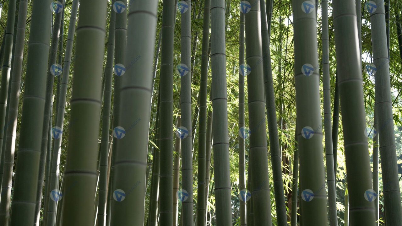 Бамбуковая роща, стволы в ряд, свет сквозь листья.