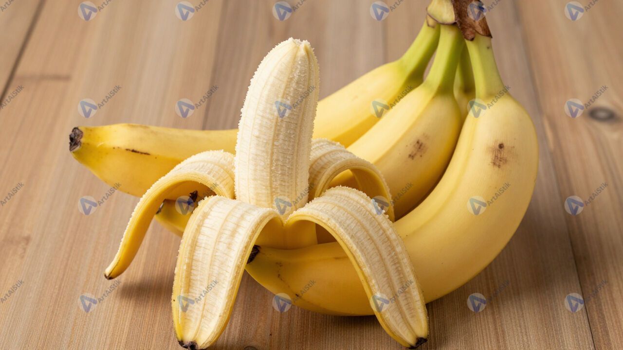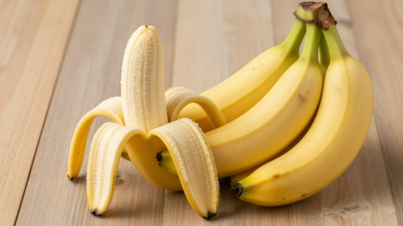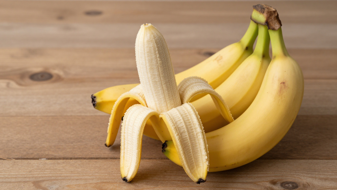 Бананы на деревянной поверхности, один очищен.