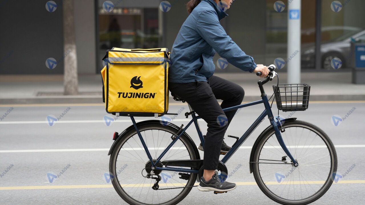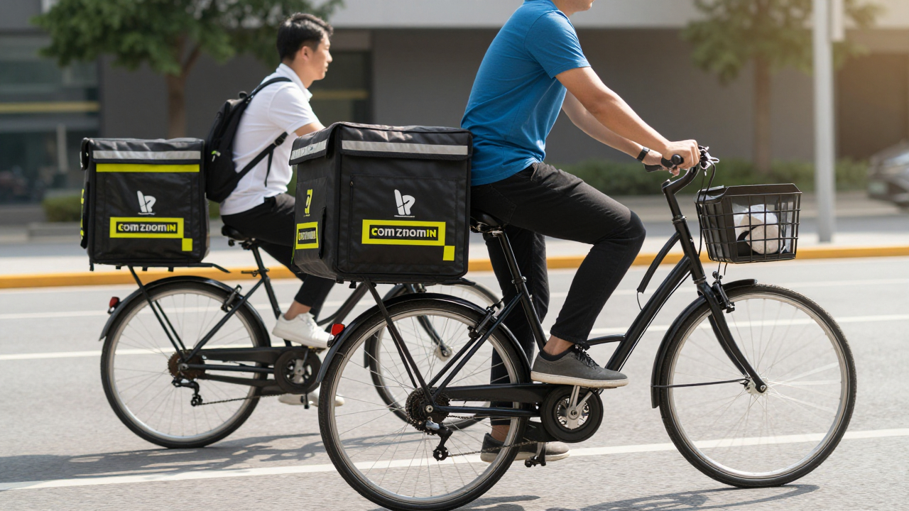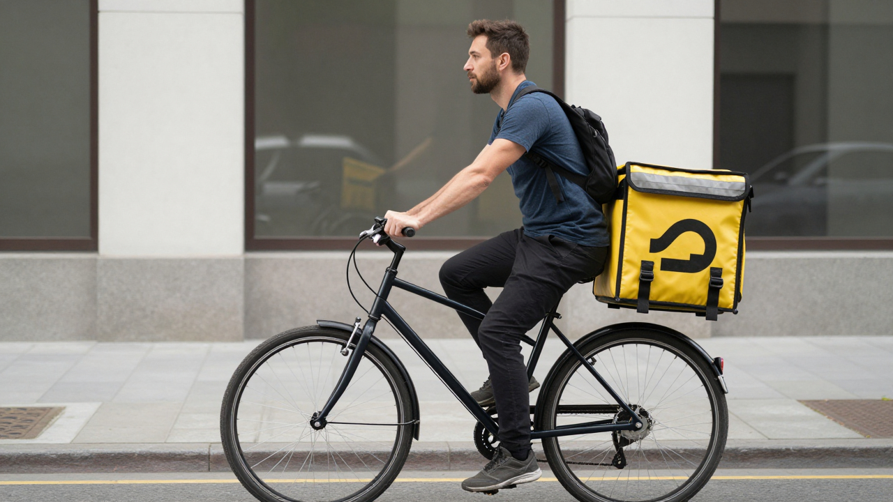 Доставка на велосипедах, курьеры в фирменных рюкзаках.