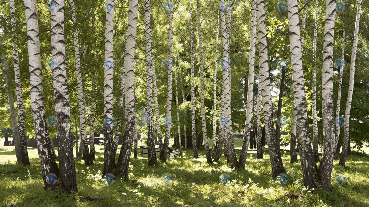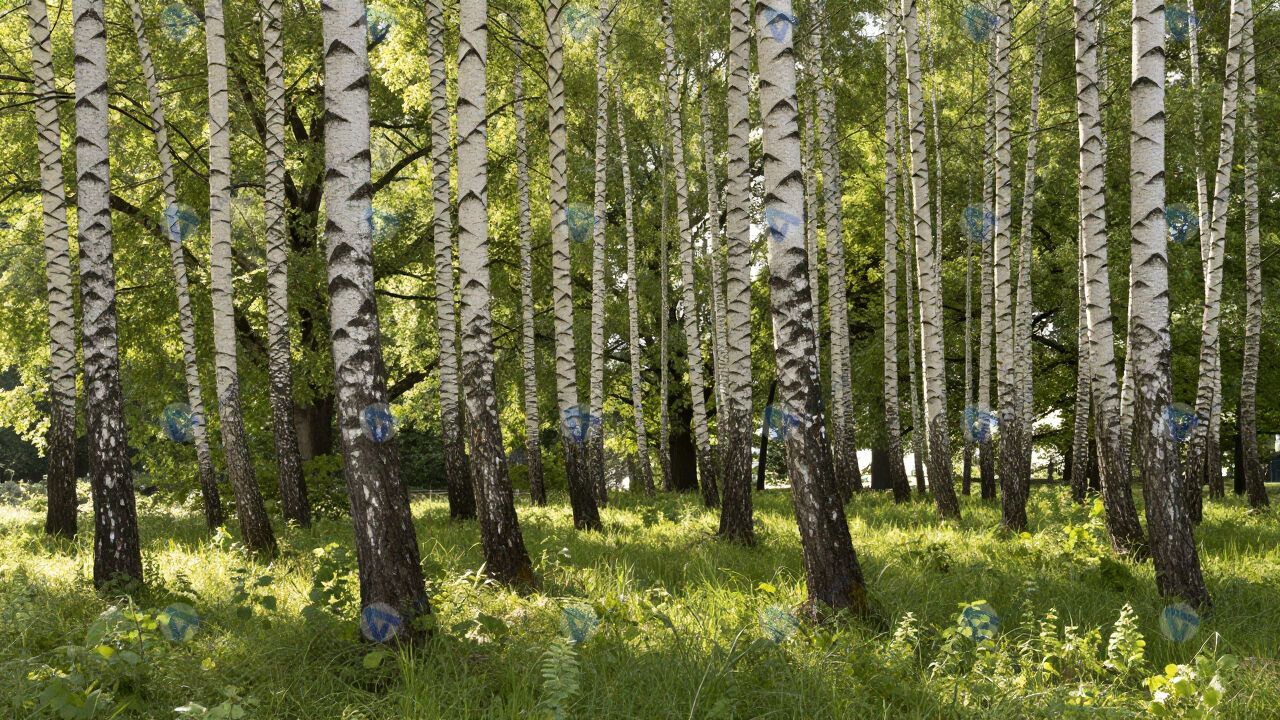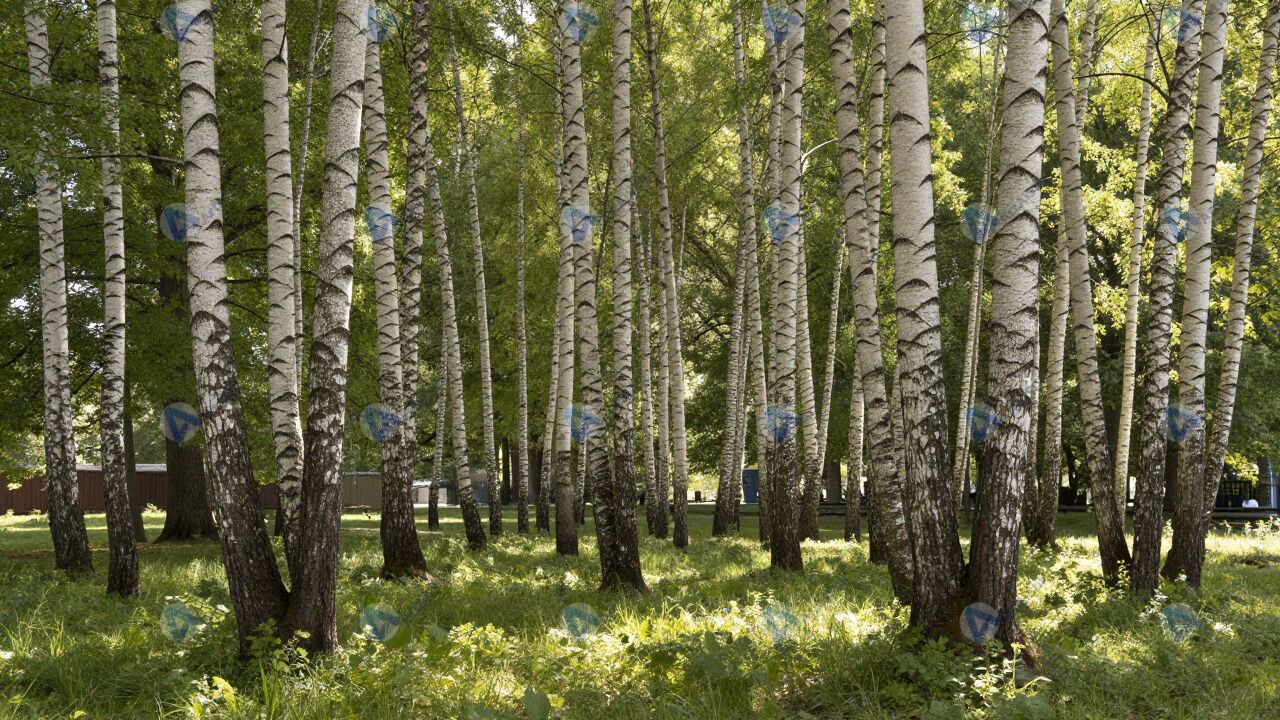 Берёзовая роща, белые стволы, зелёная листва, солнечные пятна.
