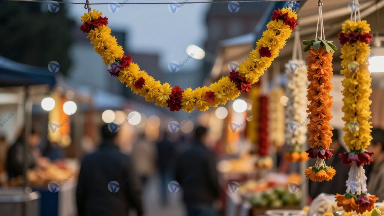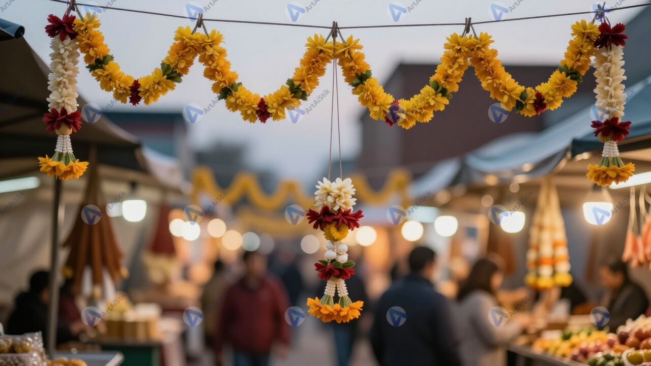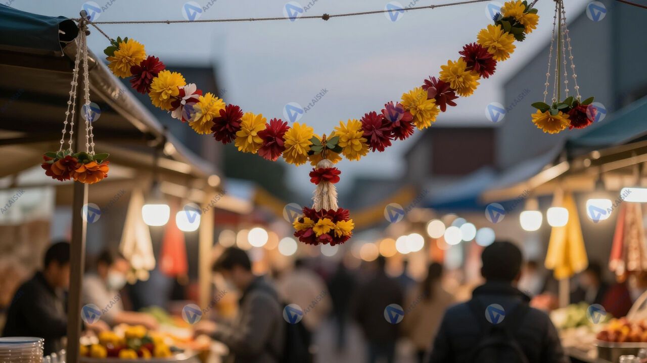 Bokeh от гирлянд на уличном рынке в сумерках.