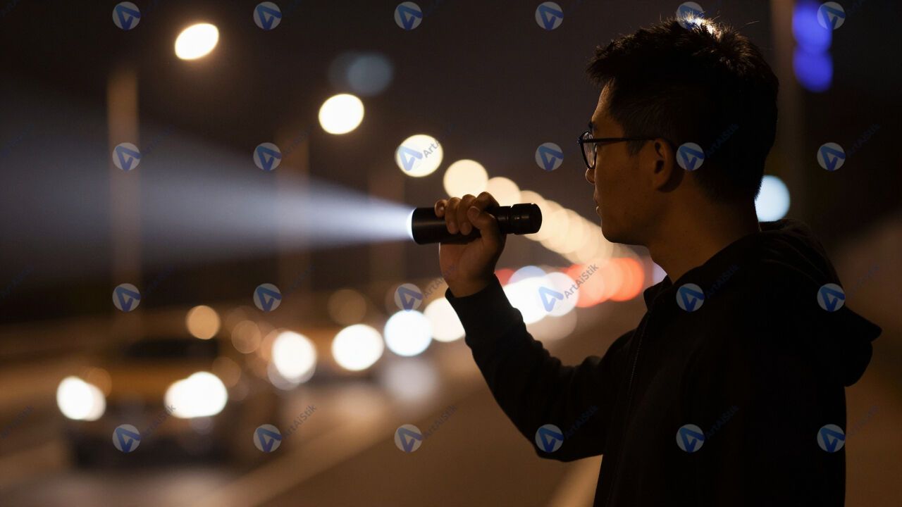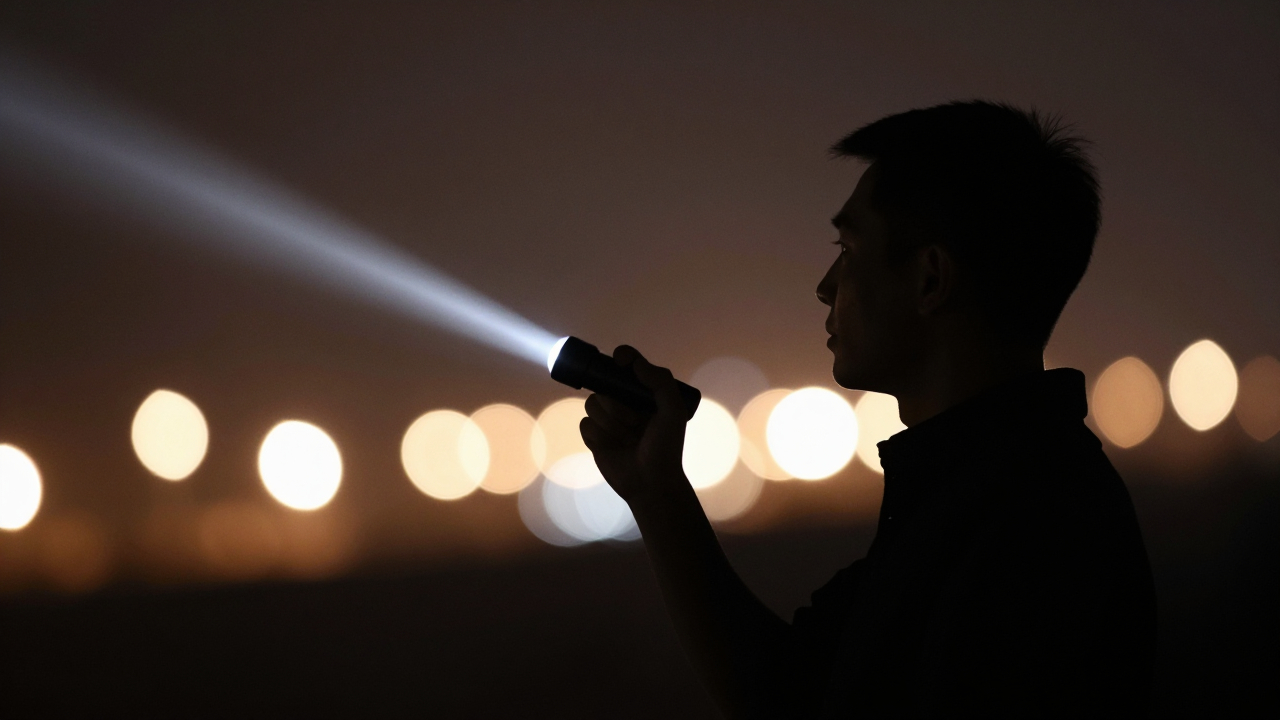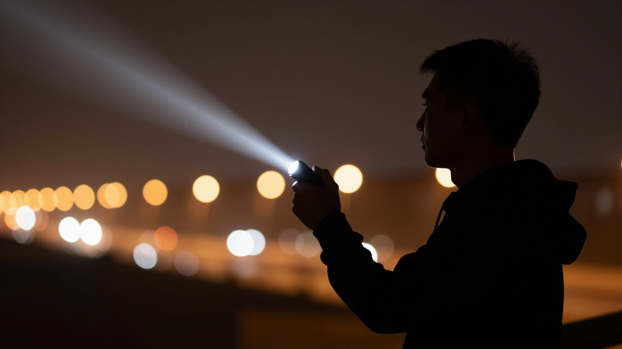 Bokeh‑огни позади силуэта человека, который держит в руках фонарик.