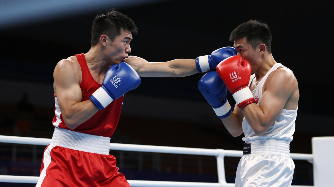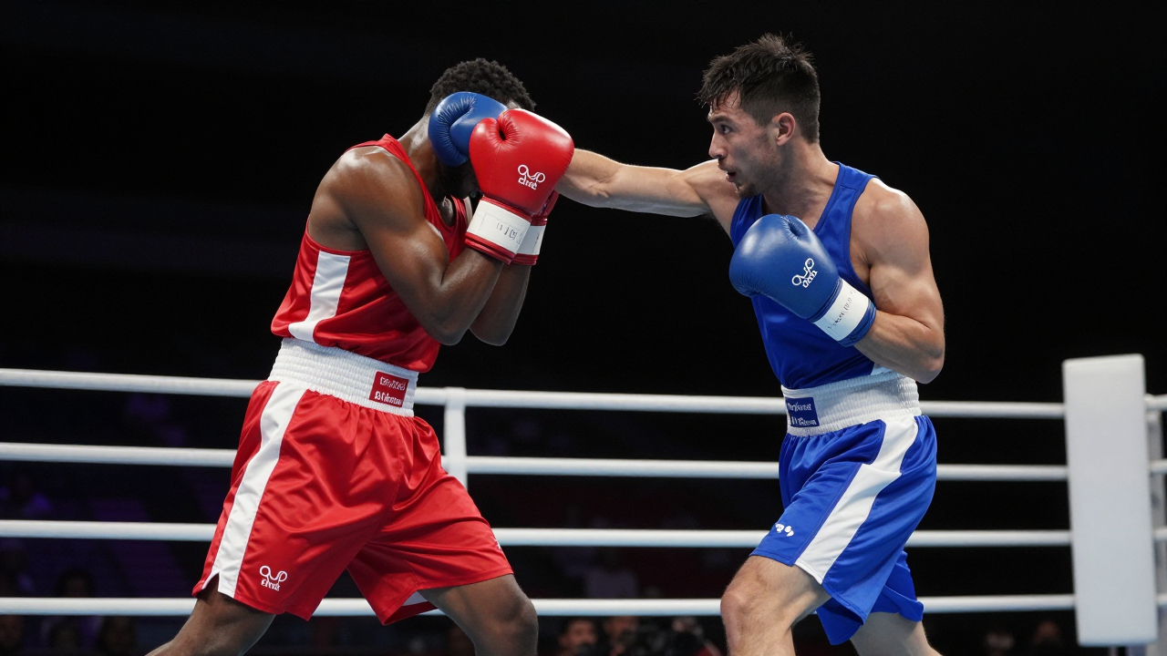 Боксёры на ринге, один наносит удар, другой защищается.