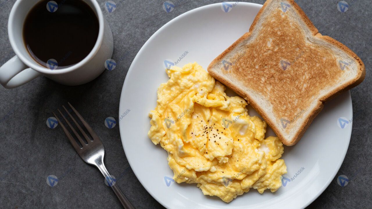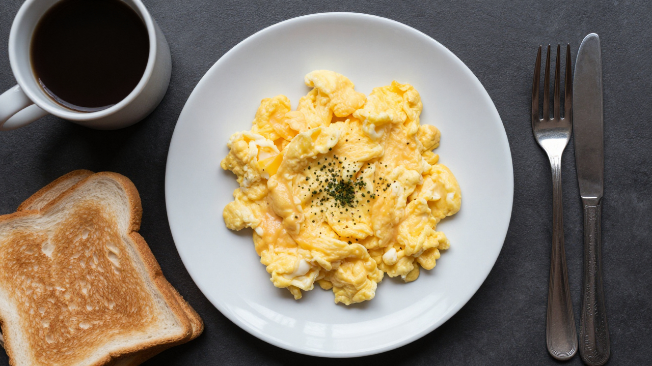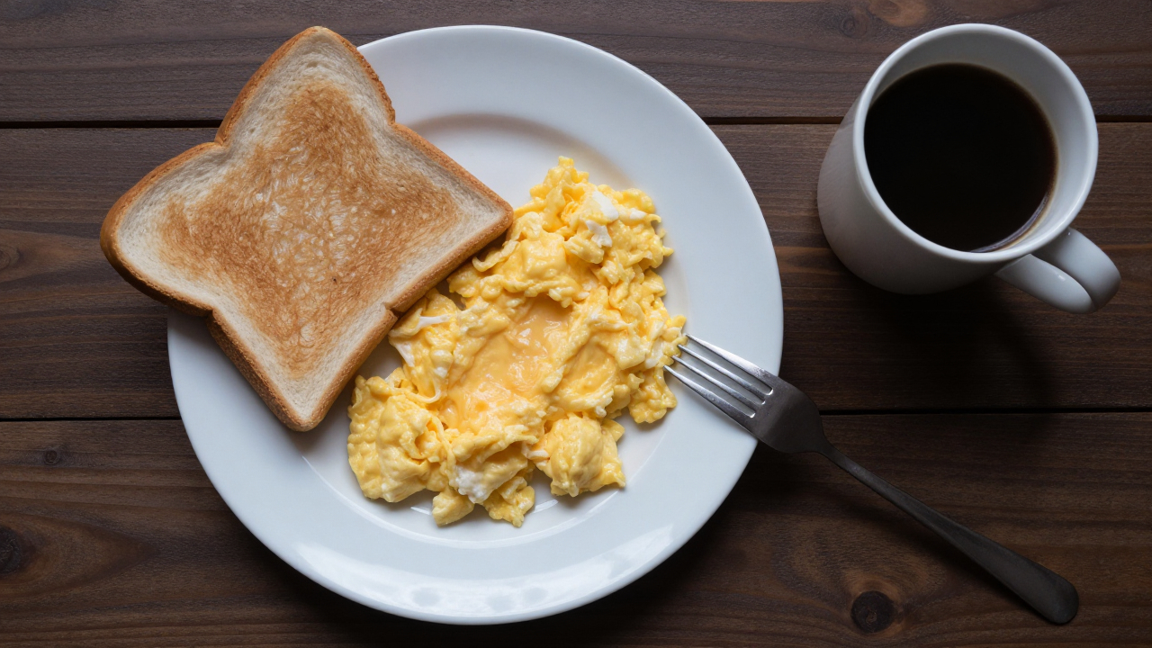 Завтрак: яичница, тост, кофе, вид сверху.