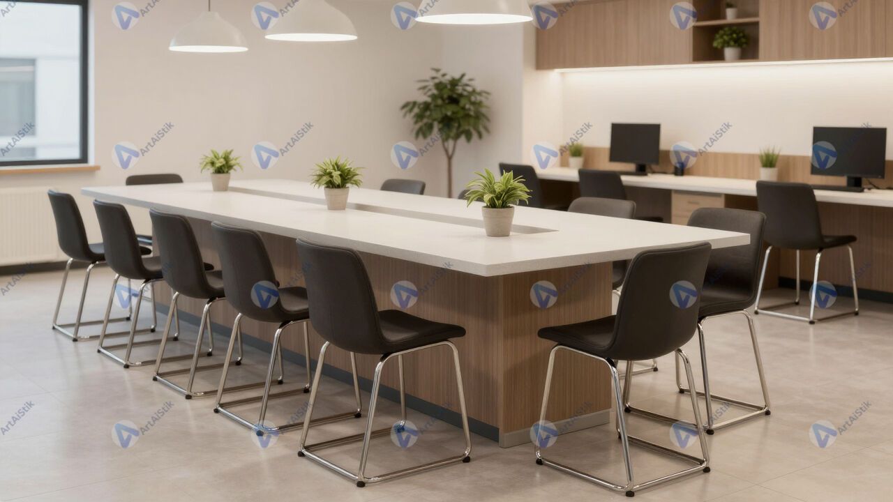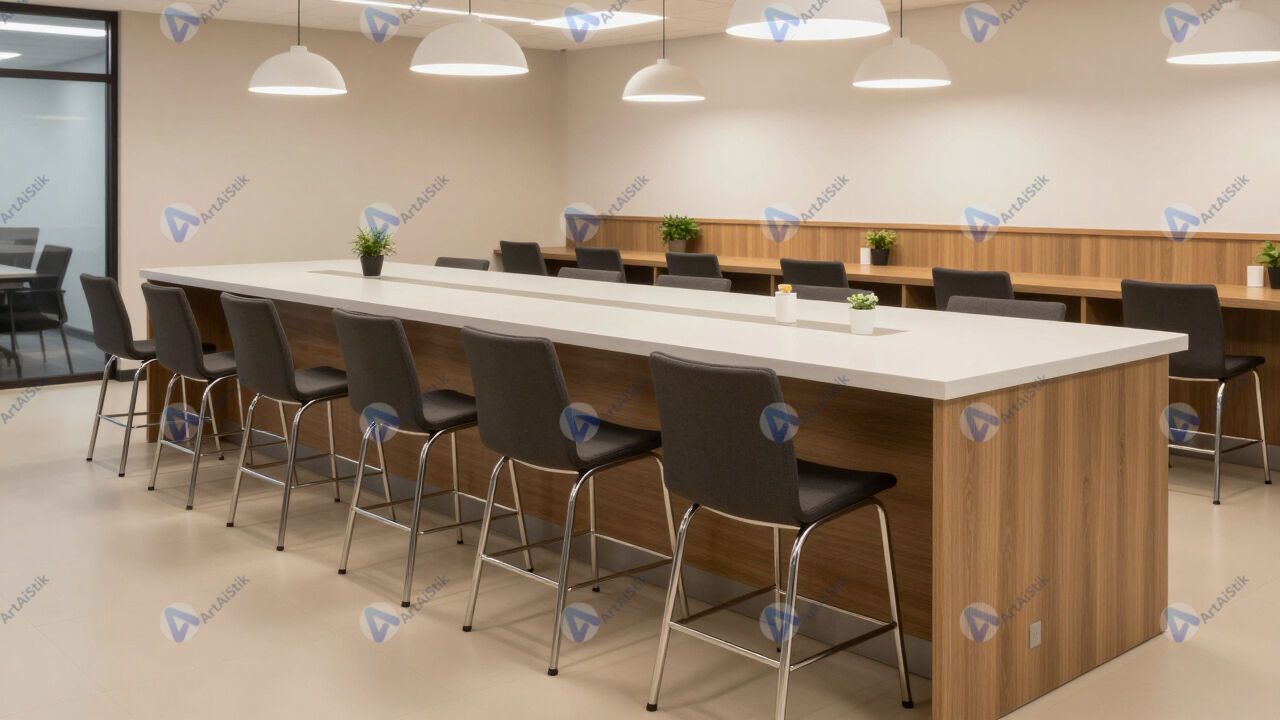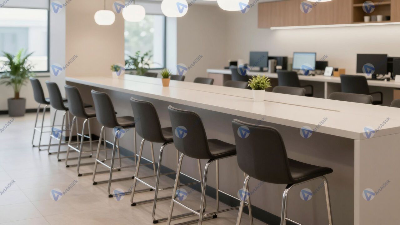 Кафетерий в офисе с длинной стойкой и высокими стульями.